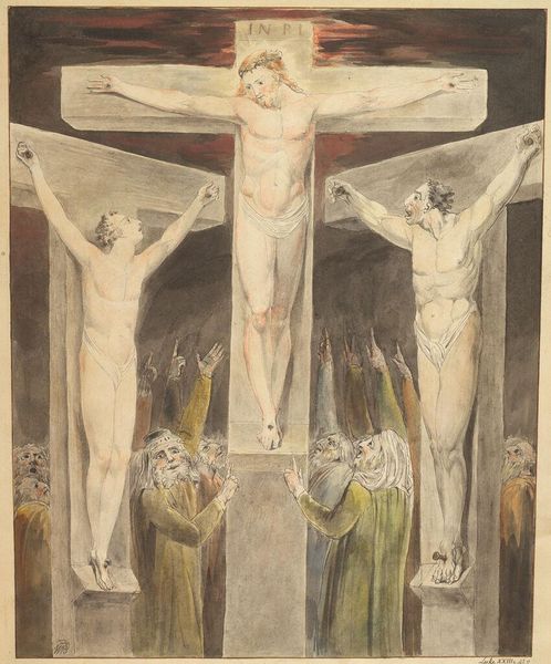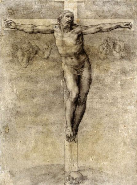 Editor: Here we have Michelangelo's charcoal drawing, *Study of "Christ on the Cross between the Virgin and St. John the Evangelist"* from 1556. The starkness of the medium lends such drama to a powerful scene. How do you interpret the use of charcoal here, especially in conveying the emotional weight? Curator: This work, while seemingly a traditional religious scene, offers a poignant intersection of faith, power, and identity within the context of 16th-century Italy. Michelangelo's use of charcoal, a medium capable of both intense darkness and delicate shading, mirrors the era's turbulent religious climate and the challenges to established dogma. Editor: How so? Curator: Consider the deliberate rendering of Christ’s body: the raw physicality challenges the idealized portrayals often favoured by the Church, nodding to a more human, vulnerable figure. Simultaneously, the Virgin and St. John can be viewed through the lens of gender and power. What does their posture suggest to you? Editor: Well, they appear supportive, almost as if they are bracing themselves for an impact. Curator: Exactly. Are they mourning passively, or actively resisting? Michelangelo’s strategic choices invite us to question the prescribed roles and expectations imposed on these figures within the religious narrative, challenging the power dynamics embedded within societal and religious structures. What do you think? Editor: It is a bit different than I had originally seen it but understanding Michelangelo's drawing in a social context really brings forward important, thought provoking discussions. Curator: It's essential to continually engage with these dialogues, to understand how art acts as a lens through which we can critically examine our past and our present.