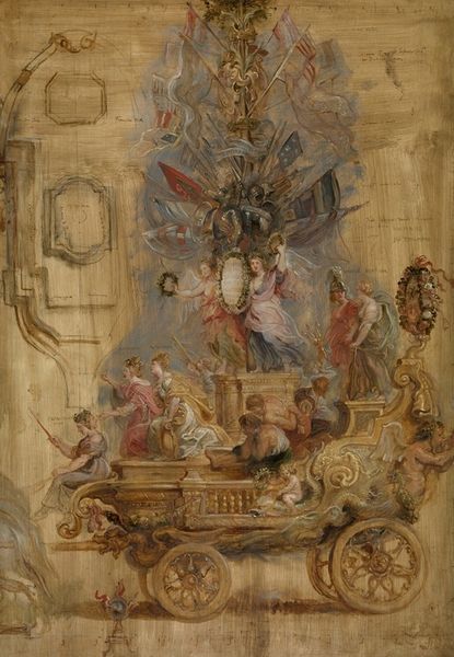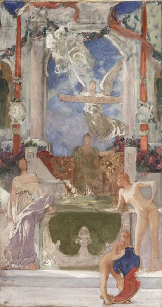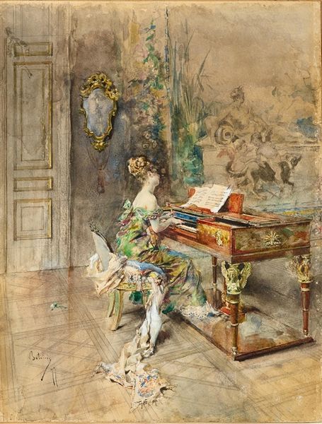 Curator: Let's take a closer look at "A friend of the Marquis", an oil on canvas crafted by Giovanni Boldini in 1875. It offers such a vivid snapshot of its era. Editor: It feels theatrical! The dynamism of the brushstrokes, the opulence of the room—it's almost dizzying but utterly captivating. Curator: Indeed. Boldini positions us right within the social swirl of the late 19th century. We see a well-adorned woman caught mid-motion, perhaps entering to greet the lounging marquis, whose languid pose reflects the leisure of the upper class. Editor: Look at the detail of the dress. The color is very vital, an emblem for that time. What does that communicate? Curator: Well, floral patterns became exceedingly popular during that period. Such fashion trends displayed the reach and cultural authority that Paris, the undisputed style center, wielded over the era. We often consider these genre scenes—moments snatched from daily life—and forget just how contrived they truly were to portray affluence. Editor: Contrived perhaps, yet I'm struck by how this interior space and the characters' gestures form a tableau that speaks to more than just wealth. They exude charm, grace... maybe even a touch of ennui. The space almost suffocates them with its gilded cage quality, you almost sense their gilded sadness! Curator: That's a compelling reading. The trappings of aristocracy, though alluring on the surface, often masked the social constraints of these tightly defined circles. It would have reinforced their roles and their public and private responsibilities. Editor: Precisely. See how that seemingly unimportant white puppy becomes a symbolic hostage to this artifice, trapped forever by rigid walls and ornate detailing. Boldini gives these interiors, and their subjects, a stage for playing out identity within the rigid parameters of that world. Curator: He did capture a particularly fleeting moment in that world before modern sensibilities and shifting political winds forever reshaped the aristocracy's role in society. These lavish spaces are monuments, testaments of the time. Editor: Exactly. The eye isn't just invited, it's practically dragged into a space where wealth talks, but there are also deeper meanings, ones about change and loss. That interplay makes it interesting.