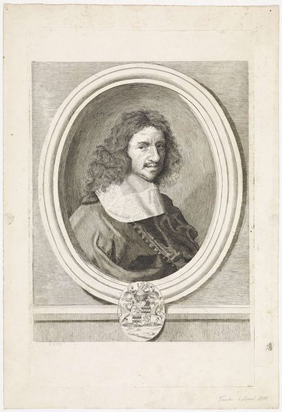 Curator: Take a look at this finely rendered engraving, titled “Portret van Charles de la Porte,” created sometime between 1675 and 1727 by Claude Duflos. What's your first impression? Editor: The detail is incredible! I'm immediately drawn to the intricacy of the lace collar and the decorative jacket. It's a stark image, perhaps suggesting something of the man's character? Stoic, perhaps? Curator: The process of engraving allows for such meticulous detail. Consider the labor involved in producing the original plate. Each line is carved manually. What this suggests to me is a high demand for accurate portrayals, maybe for distribution or for marking someone's importance in society? Editor: Absolutely, and it's critical to situate a piece like this within its socio-historical framework. Who was Charles de la Porte, Duc de la Meilleraye? Power and status dictated who got their portraits made. Let’s consider the ways in which gender and class intersect in visual representations such as these. Curator: I am thinking more about how the circulation of such engravings might affect the social landscape: Do they serve a purpose? Are these intended to solidify power structures? This reproduction creates accessibility to something formerly possessed only by those in the ruling class, but the materials indicate it is still reserved for people who have access to higher levels of consumption and education. Editor: That intersection between power and portrayal is precisely what makes portraits like these so compelling. The way Duflos uses line here isn’t merely decorative; it communicates the Duke's societal position. It creates a discourse between identity, presentation, and authority. What would the impact of these images be to a community? Curator: By dissecting Duflos's technique and acknowledging the labor involved, we begin to see not only artistry but also the societal framework influencing artistic production. This forces us to examine art's interaction with economics, politics, and consumerism, pushing us to think beyond purely aesthetic values. Editor: Indeed. It reminds us that even what seems like a straightforward portrait is deeply embedded in layers of social and political context. Examining those connections gives the work greater meaning. Curator: A striking piece when considering the means through which it was made, as well as its purpose as propaganda for an upper class elite. Editor: I agree. Duflos's rendering not only captures an individual's likeness, but serves as a marker for an era and its hierarchical structures, too.
