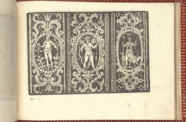Editor: We're looking at a page from *Schön newes Modelbuch* created in 1608 by Sigismundus Latomus. It’s a woodcut print and the sharp contrast between the black ink and the paper is really striking. There's so much detail packed into such a small space, it's amazing! What stands out to you most in terms of its formal qualities? Curator: Indeed, the rigorous play of positive and negative space commands our immediate attention. Consider the black field; it operates not merely as background but actively shapes the figures within their respective frames. Note the symmetry present across the composition, how each panel leverages repeated motifs— scrolls, florals, winged creatures— to create visual harmony. Do you observe how this symmetry might also introduce a certain rigidity? Editor: Yes, now that you mention it, the symmetry almost feels…static. It's beautiful, but it lacks a certain dynamism, perhaps? I also notice the figures within the frames. Are they positioned to lead our eye through the work in a specific way? Curator: Precisely. Each figure’s pose and attributes guide the viewer’s eye. Observe the figure on the left holding what appears to be an orb or fruit; its gesture opens towards the center. The central figure’s posture seems confrontational as if asserting space and control. We can read the contrast and how it dictates a kind of balance. Do you think that contrast is heightened because we're looking at nudes? Editor: It definitely adds to it, given their placement within such ornate, controlled borders. Seeing them alongside the figures beside them suggests their relationship must have some purpose within the context of the book. Thank you for pointing out all those structural details, I see the page with new eyes! Curator: My pleasure. It’s in close observation of these formal elements that the deeper registers of meaning become accessible. Considering the formal relationships lets us pose critical questions regarding intent and construction.
