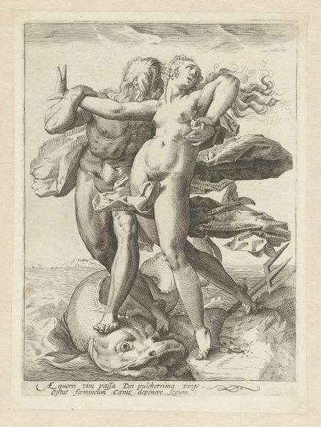 Curator: Standing before us is "Orpheus standing at left playing the violin, Eurydice at right covering herself," an engraving dating back to the early 16th century, somewhere between 1504 and 1514. The artwork is attributed to Marcantonio Raimondi, a prominent figure of the Italian Renaissance, and is part of the collection here at The Met. Editor: Oh, I see immediately that melancholic strain of the Renaissance. It's such a study in muted emotions; both figures seem caught in this quiet drama, an intimate sorrow played out in the delicate lines of the engraving. Curator: Exactly. The piece illustrates the tragic tale of Orpheus and Eurydice, just not the ending that we perhaps yearn for. He’s playing, yet his gaze is downcast, and she averts her eyes, already beginning her return to the underworld. This image really shows Raimondi's skill in translating classical narratives through printmaking, popularizing them for a wider audience. Editor: He almost traps them both in amber! But, there's a palpable tension here; the violin—a strangely anachronistic touch, isn't it, for the Orpheus myth—seems almost like a barrier, physically and emotionally, separating them, rather than the means to their reunion. Is Raimondi commenting on art's limitations, perhaps? Its inability to fully bridge life and death? Curator: It's certainly a point of discussion, the violin, with its elaborate form depicted. Raimondi likely borrows the figures' idealized forms from classical sculpture and combines them with contemporary musical instruments. The musical aspect of Orpheus’ myth had particular social currency then, particularly associated with artistic gatherings. It reflects not just a retelling, but a re-envisioning of a classical story through the lens of the Renaissance, a bit like remixing an ancient song with modern instruments, if you will. Editor: It does make you think about art’s constant renegotiation with the past. You've got this intensely private moment, made public through reproduction, now framed and preserved for us. How do we wrestle with these inherited images of grief, love, loss, that just circulate endlessly in museums, in popular consciousness, each time accruing more meanings, and peeling away more history? Curator: That’s very eloquently put. This work showcases the beautiful tension of influence, borrowing, and reinvention that sits at the heart of the Renaissance itself. Editor: So in its muted grief, perhaps this engraving whispers about our own fragile acts of preservation and interpretation, forever in conversation with those long gone?
