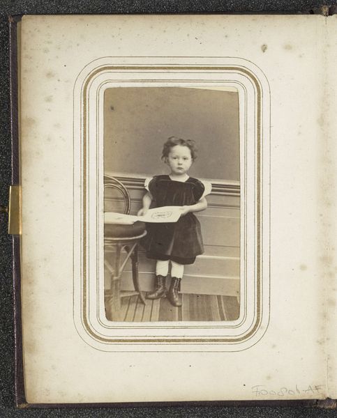 Albert Delabarre made this small photograph of a seated girl some time in the 19th century. The sepia tones lend a softness to the image, emphasizing texture and form through light and shadow. The girl's ornate chair and the draped curtain create a formal composition, drawing attention to the sitter. Delabarre uses a formal studio setting to capture the essence of childhood. The sharp focus on the girl contrasts with the softer background, underscoring her presence. The semiotic interplay between the girl's dress, the chair, and her solemn expression invite us to consider the structured nature of portraiture and the cultural codings of childhood. The photograph destabilizes the line between staged representation and authentic expression. This tension highlights how even seemingly straightforward images are shaped by social and artistic conventions, prompting us to question the act of seeing itself.