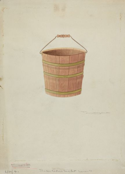 Curator: This lovely, albeit humble object, is a 1939 watercolor and drawing titled "Milk Bucket" by Jacob Gielens. Editor: There's a quiet dignity to this image. It's carefully rendered, but almost worn; like a memory of daily life softened by time. Curator: Yes, it evokes the past! Consider the milk bucket itself—such a commonplace object would have represented the entire chain of farm labor, from animal husbandry to butter-making. The bucket would hold symbolic and material importance for the family. Editor: Exactly! And the rendering really emphasizes that materiality. Look at the details of the wood grain. You can almost feel the rough texture. It’s far from idealized. The slight imperfections, those gaps between the slats – those speak to a life of utility and possibly even wear and tear, raising a lot of questions. What was it used for? Was it heavy when full? How long did it last? Curator: And what kind of cow supplied the milk, and what was *her* history? It suggests an entire world unseen within the drawing itself. The form of the bucket has deeper roots too. We see echoes in ancient vessels throughout different cultures; this is a form both universal and very specific to its time. Editor: Thinking about it, the choice of watercolor seems significant too. Its delicacy almost contrasts with the robustness we'd expect from the object. Was it hard to find such fitting ways to create volume without any dark colors? Curator: Indeed, that tension creates depth; making something everyday carry real meaning for the present and past, not to mention potential for future interpretation. Editor: A perfect, humble monument! I can see so much more after that closer look. Curator: As can I, looking through the lens of labor to bring deeper meaning and appreciation to the past.
