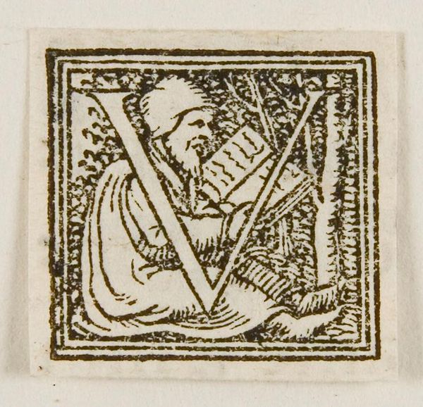 Curator: Here we have an intriguing woodcut simply titled "Letter P," by an anonymous artist, held in the Harvard Art Museums. Editor: The density of line-work gives it a weight, almost oppressive. What can you tell me about the figure? Curator: Well, beyond being incorporated into the letterform, the figure’s apparel suggests a certain societal status, perhaps connected to early printing houses or institutions of power. Editor: The letter itself seems almost organic, embracing the figure. It evokes a sense of protection, or perhaps confinement, depending on how you read it. What cultural symbols can we identify? Curator: The "P," of course, potentially a marker of religious or political authority. It suggests a world governed by symbols and hierarchy. Editor: So it presents a glimpse into the past, where even letters carried inherent power and meaning. Curator: Indeed, a powerful reminder that the written word has always been more than just communication.
