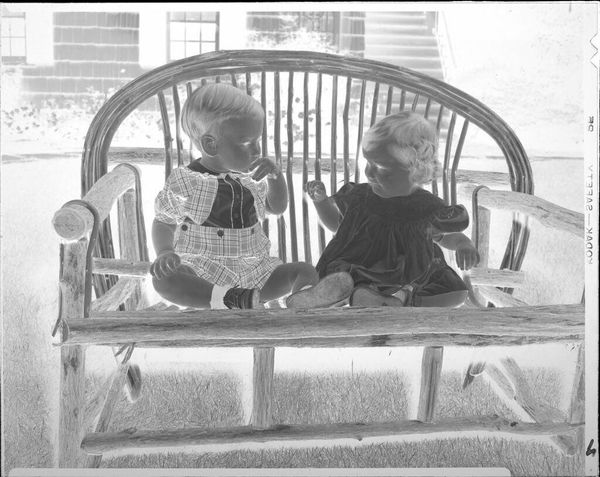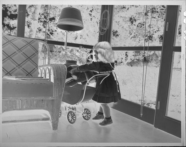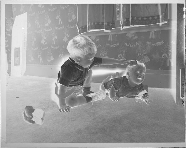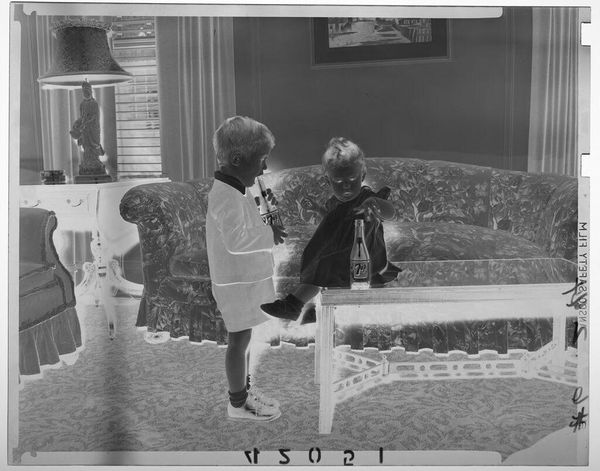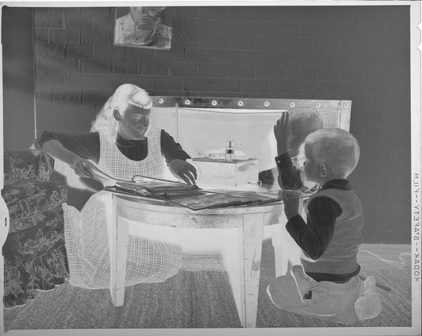 Editor: This interesting photograph, "Untitled (children playing with blocks)" by Lucian and Mary Brown, captures two children at play. The negative format highlights the materiality of photography itself. What stands out to you? Curator: Notice the texture; the rug, the children's clothes, the blocks themselves. All made, purchased, used. How does the labor of creating these objects, and the subsequent consumption and play, reflect societal values around childhood and domesticity? Editor: That's a perspective I hadn't considered. So the focus is less on the children themselves, and more on the world of objects that surrounds them? Curator: Precisely. The image becomes a document of material culture and the processes that create it. It's a commentary on the constructed nature of childhood.
