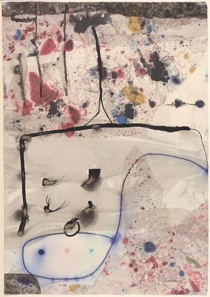 This work, made when Hamilton was an art student, is one of a group in which he tried to present movement from an interior through a doorway to the space outside using the simplest elements possible. He realised that even a single line against the canvas can suggest space: its relative shape, size, colour, position and direction are all subconsciously interpreted by the human mind as having three-dimensional properties.Here, the stick-like units imply three-dimensional space, while the black spots are diagrammatic symbols that mark vanishing points. Gallery label, August 2004