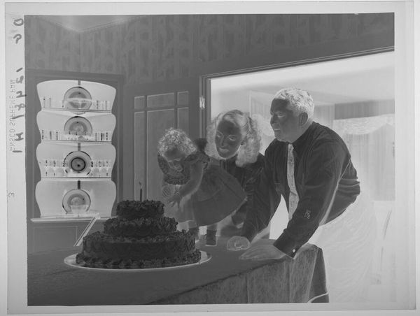 Curator: This photograph by Martin Schweig, titled *Untitled (elderly couple cutting golden wedding anniversary cake)*, captures a seemingly simple moment. Editor: The stark contrast immediately strikes me—a play of light and shadow that lends the scene a rather ethereal quality, almost dreamlike. Curator: Precisely, the composition emphasizes the interplay between the subjects and the objects; the cake, for instance, acts as a pivotal point, anchoring the gazes. But consider the material aspect. The photographic process itself, the developing chemicals, the paper... Editor: It is a beautiful document of a specific social ritual, centered around labor of love and celebratory excess, don't you think? The crafting of the cake, the floral arrangements... they all speak to a collective effort. Curator: I concede that such social contexts are present, but the arrangement, the subtle gradations of tone—these elements lift the image beyond a mere snapshot. Editor: Perhaps. Ultimately, though, it is about shared experience, materialized through objects and actions. Curator: A compelling point. Schweig certainly captured something significant, regardless of one's interpretative frame.