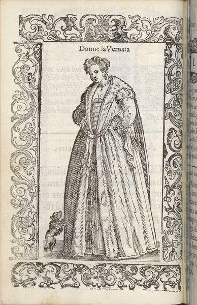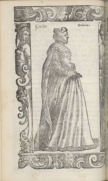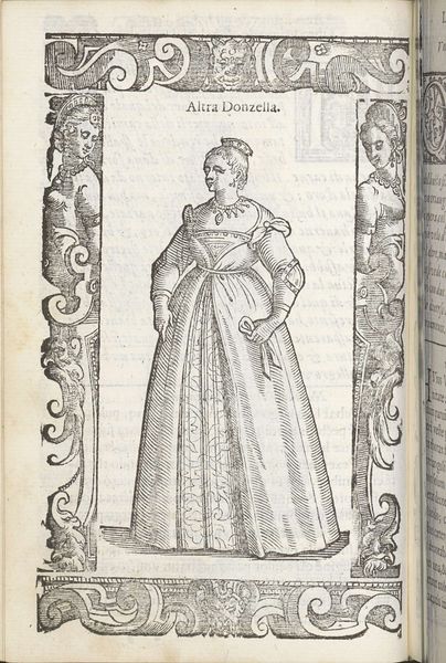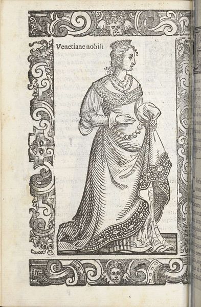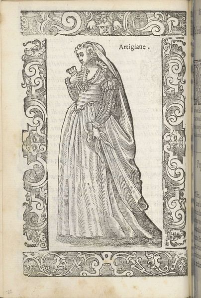 This woodcut, "Sposa ornata di Norimberga," depicts a bride adorned in the style of Nuremberg, capturing the city's cultural pride in its marital customs. The bride's elaborate headdress is a key motif here; its vertical height recalls similar headpieces found in depictions of secular and religious women, such as the Virgin Mary, signaling purity, status, and perhaps even a connection to the divine. Note her gesturing hands, this could be traced back to antiquity, reappearing in Renaissance art, yet here it suggests an acceptance of marriage and new responsibilities. The frame of the image is decorated with grotesque masks: they serve as apotropaic symbols, warding off evil spirits, and they reappear on buildings throughout the 16th and 17th centuries. These strange figures, with their gaping mouths and exaggerated features, stir deep-seated emotions, and it's no accident that these symbols reappear across cultures and eras; they tap into our primal fears and fascinations, shaping our understanding of protection and the unknown. This symbol evolves from its original form into a decorative element, carrying the faint echo of its protective power. The image blends cultural pride and deep-rooted superstitions, reminding us of the continuous evolution and psychological power of symbols.