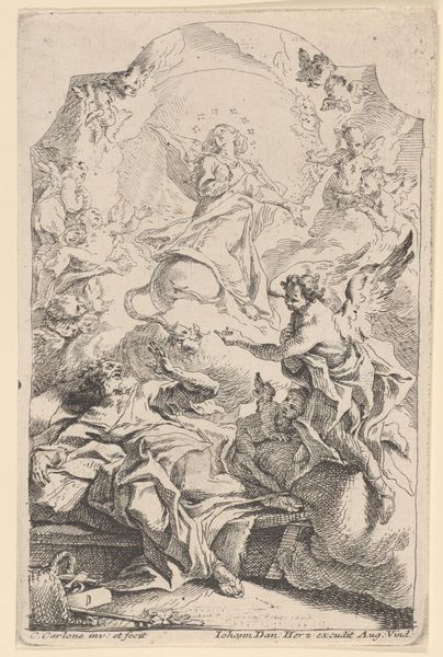 This print, titled "Gekroonde Cupido," was made by an anonymous artist. Its themes of love and triumph were extremely popular in the printmaking industry of the Dutch Golden Age. Cupid, the Roman god of love, is depicted here as a crowned figure, suggesting that he holds some kind of power. The image itself is framed by elaborate ornamentation typical of the Baroque era, reflecting the period's emphasis on grandeur and theatricality. These visual codes would have been instantly recognizable and relatable to contemporary viewers. This print would have been circulated among collectors and art enthusiasts, contributing to a shared visual culture that helped to reinforce social values and norms. Historians can use a wide range of documentary sources, such as inventories of art collections, auction catalogs, and artists' correspondence, to better understand the social and institutional contexts in which prints like this one were produced and consumed. The meaning of art is always contingent on the society in which it’s made.