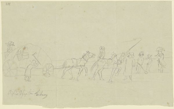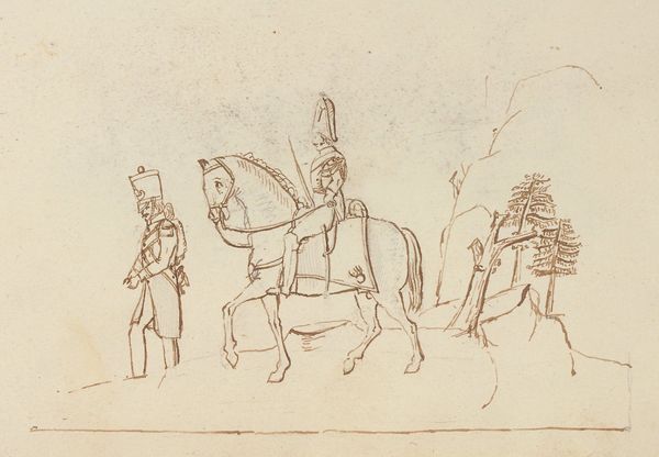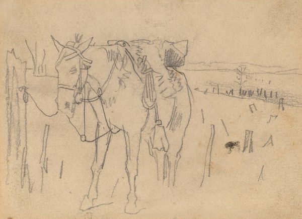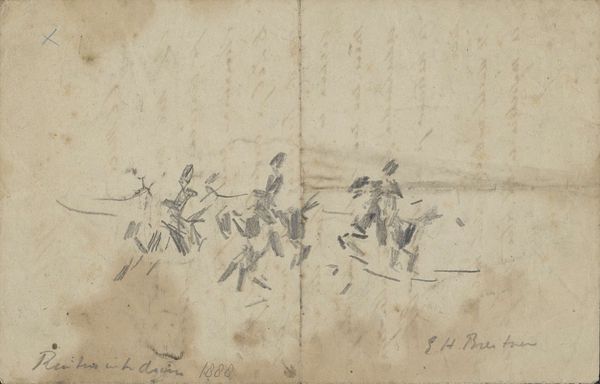 Curator: Here we have a drawing by George Hendrik Breitner, titled "Landscape with Cavalry Soldiers," estimated to have been created between 1876 and 1886. It's currently held in the Rijksmuseum collection. Editor: My first impression? It's raw. The figures are just suggested, almost fleeting. You can practically smell the graphite. Curator: Exactly! Breitner was known for capturing everyday life in Amsterdam, often focusing on the working class. This drawing provides a glimpse into his process. How do the rough lines play into that do you think? Editor: The sketchiness lends a sense of immediacy. Breitner’s prioritizing capturing movement, the fleeting presence of these soldiers and horses. The visible strokes really emphasizes the handmade, the artist's direct engagement with the scene and the material. Curator: It is tempting to wonder, in Breitner's practice of photography alongside painting, where drawings such as these served in relation to those other works in terms of his final depictions. These were tumultuous years marked by social unrest, rising nationalism… Editor: Right, but consider the paper itself. What was the cost, the availability of materials at the time? And how does the act of sketching, quick and portable, differ from say, large-scale paintings that required studio space and assistants? Those factors shaped who had access to art making, what subjects were deemed worthy, and how these scenes were ultimately consumed. It becomes a democratic document when you look at the materiality, not only the society of the time. Curator: A critical tension, isn't it? Breitner sought to depict modern life, to engage with these social changes through observation of materials while the art world often favors more polished products... Editor: I see his quick lines as him playing within this tension—simultaneously nodding at artistic traditions of landscapes and battle scenes, yet breaking them down into these skeletal marks reflecting on art itself. Curator: A fascinating dialectic that underscores Breitner's own ambivalence within the art institutions he sought recognition from. Editor: It does makes me want to handle it, and study the tooth of the paper... Curator: Agreed, it's a powerful little object!