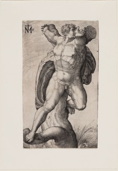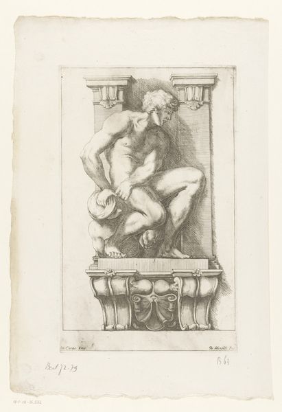 Editor: This engraving, "Man pressing down a harpy" by Giuseppe Maria Mitelli, depicts exactly that, a man and a harpy. I’m struck by the raw physicality of it. What is your perspective on this piece? Curator: Looking at the materiality, consider the copperplate engraving process. The labor involved in creating this image – the tools, the press, the ink – speaks to a broader culture of printmaking and its role in disseminating ideas and images. How does understanding this production method change your view of the work? Editor: It makes me think about the labor and accessibility of the image. Curator: Exactly. It moves beyond just the narrative of man versus harpy and into thinking about the social context of its creation and consumption. Understanding that, what do you make of the harpy’s presentation? Editor: I now see it within a larger system of production and exchange. Thanks for the insight!