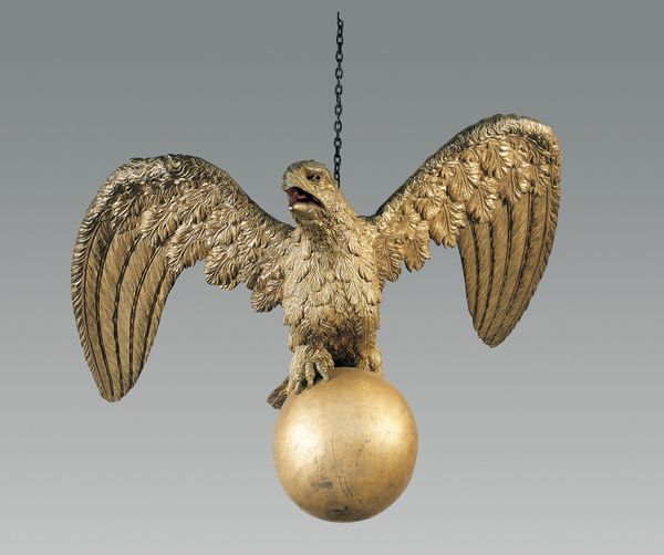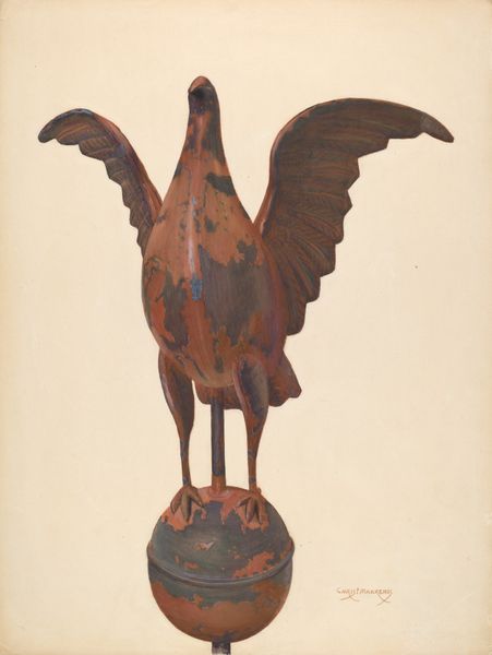 Curator: That Eagle Weather Vane, dating from somewhere in the 19th century, truly strikes me. Editor: Yes, a rather imposing object, isn't it? There’s something wonderfully elemental about it. The wind, direction, and the formidable bird, all rendered in weathered bronze. Curator: The anonymous artisan who crafted this elevated an everyday object into a potent symbol. One has to remember the eagle's presence was becoming very prominent as a symbol of American power around that time. A visual claim on territory, on the very air itself. Editor: Absolutely, and consider the eagle itself, the quintessential symbol of freedom and authority. Note the gaze directed downwards and the half-spread wings – almost as if it is choosing the moment of attack. But it seems weary in some way to me. What do you see? Curator: I agree on the potency of symbolism, but I am wary of projecting too much drama onto a functional object! Its symbolic power comes not from some intentional aggression, but from the social context in which it came to represent aspiration, a commercial brand of the "American Dream" of endless territory to be conquered, and potential profit, obviously. Editor: Perhaps! But regardless of intent, the imagery resonates. It evokes cultural memories and enduring symbols – the powerful bird as a guiding figure. Even the directional arrow beneath becomes charged with meaning, navigating not just wind, but destiny. Curator: That said, understanding these objects outside of elite art circuits allows us to trace shifts in national identity and commercial culture, rather than attributing purely aesthetic considerations to the sculptors. Think of the rooftop on which the figure perches: the home or establishment beneath that proclaims its loyalty. Editor: You are certainly right. In that context it transcends its function, almost taking on the aura of a protective spirit. So practical, and yet, unexpectedly poetic! Curator: Exactly. Thinking about this work reminds me that art has a profound civic life and popular origins, and so often it becomes a pawn in the theater of power. Editor: And for me, it underlines how even the most mundane objects carry unexpected symbolic weight, reminding us of the visual language that shapes our perception of the world.