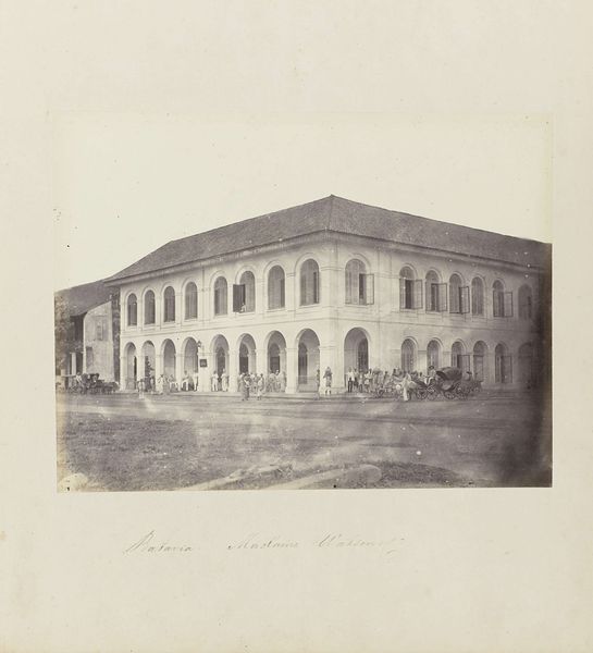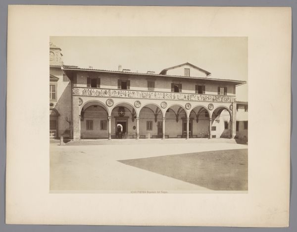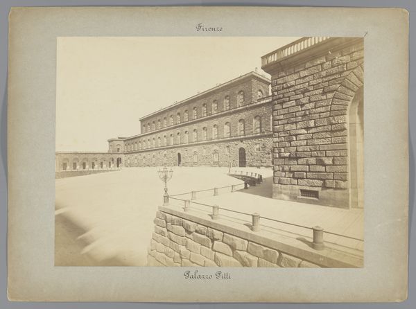 Curator: Here we have an albumen print, a photographic reproduction from between 1875 and 1900. The photo captures Domenico Ghirlandaio's fresco "The Birth of Mary," originally located in the Santa Maria Novella in Florence. Editor: It projects a sense of aged grandeur, doesn’t it? The architectural details are striking. The play of light and shadow creates a textured feel across the facade. Curator: Absolutely. Consider the historical context. Photography at this time served to disseminate artistic masterpieces to a wider audience, beyond those who could travel to Florence. It democratizes access to Renaissance art but also influences perception, doesn't it? By choosing to document specific features and viewing angles, photographic interpretation shaped its legacy, emphasizing certain cultural values over others. Editor: The act of reproduction itself transforms the image. Ghirlandaio's fresco celebrates a pivotal religious narrative, the birth of the Virgin Mary, imbuing the space with divine significance. Even filtered through the lens of nineteenth-century photography, there is the memory of holiness preserved here in visual signs of the city. Look at the blocks themselves. Curator: I agree, and consider that while celebrating Mary, these frescoes were funded and meant to enhance the status of wealthy families of Renaissance Florence. Ghirlandaio’s works showcase their power. Photography captured and broadcast those markers of identity across time. Editor: What's so interesting is how that initial commission informs the visual weight it continues to hold now, so many centuries later. Even in reproduction, you see the layers of meaning imbued in that act of capturing, which is almost another layer added onto it, even in its aged condition. Curator: Exactly. The choice of focusing on the architecture can underscore specific meanings, reinforcing social hierarchies linked with patronage. This shifts our understanding of art and class identity, something still very potent today. Editor: Thank you, this photograph gives a compelling visual echo. It’s a testament to how meaning persists and evolves. Curator: A lasting image.