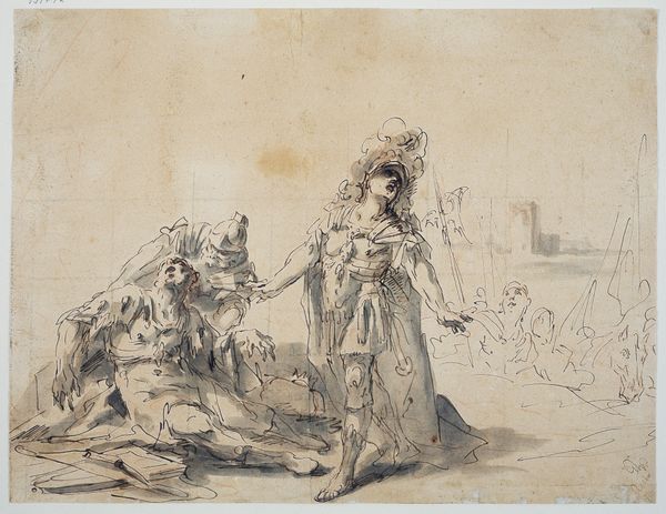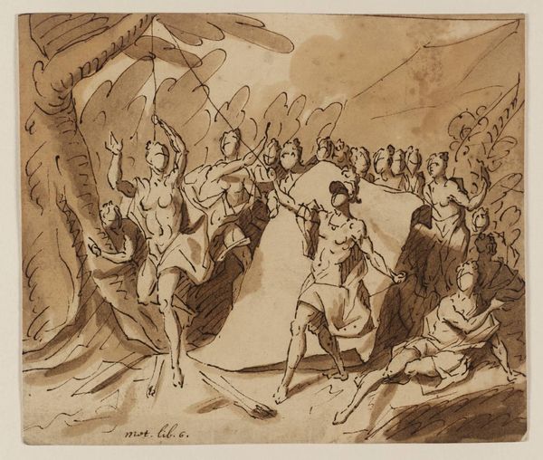 Curator: This delightful watercolor lithograph is entitled "Pierrot et sa famille." Its creation is attributed to Christian Holm sometime between 1803 and 1846, and it currently resides at the Statens Museum for Kunst. Editor: My immediate impression is a chaotic, almost grotesque tableau. The figures, though presented as a family, appear disjointed and rather…unhinged. There’s a nervous energy about it. Curator: Indeed. The image draws heavily on the archetype of Pierrot, the lovelorn clown, but subverts his traditional melancholy with a rather bawdy, almost burlesque depiction of domesticity. Observe the tall hat and the exaggerated expressions – Holm uses these markers to highlight both Pierrot’s pathos and his absurdity. He becomes a symbol of societal misfits. Editor: I'm struck by the composition. The loose application of the watercolor and lithographic line creates a sense of instability. Note how the figures are arranged—almost tumbling out of the frame, the light and shadow further heighten the dramatic effect. This deliberate imbalance emphasizes the topsy-turvy nature of the scene. The pale wash accentuates line to imply shape, giving the artwork structure in a delicate way. Curator: Precisely. The symbolism is rather rich if we think of Pierrot's historical and cultural trajectory. Originally a figure of longing and unrequited love within the Commedia dell'arte, Holm's version presents us with a distorted, almost perverse take on family life. What does it say about the societal anxieties of his time? It might even be read as social critique using visual tropes already laden with history and cultural weight. Editor: From a formal perspective, consider the palette; the limited range of colors— predominantly whites and pale blues, with the exception of the wine bottle’s browns — heightens the starkness of the figures. The economy of the media is striking in creating expressive forms. The artist relies on shape, not texture, to depict tone and shadow. Curator: The longevity of Pierrot as a symbol, from the stage to visual art, demonstrates his enduring relevance. This caricature by Holm highlights how a recognizable cultural symbol continues to transform and reflect societal conditions over time. Editor: Looking at this lithograph, one certainly gets the sense that form really does follow function: a fractured aesthetic represents, with clarity, a fractured family.