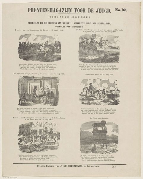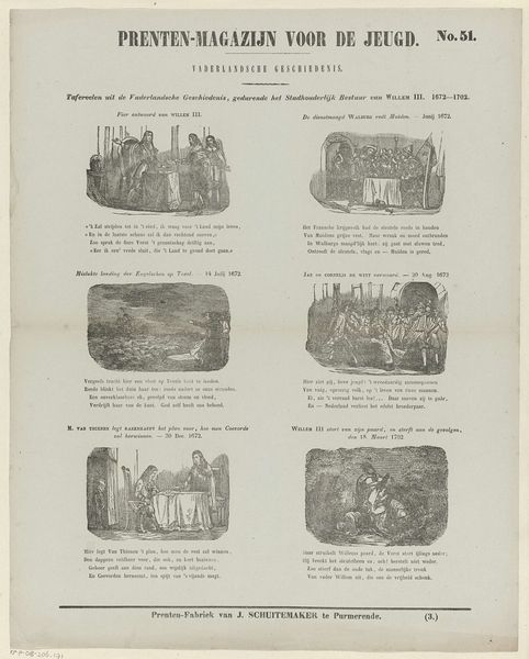 Editor: This print, "Tafereelen uit de geschiedenis van ons vaderland…" by Dirk Noothoven van Goor, probably made between 1850 and 1881, depicts scenes from Dutch history during the French occupation as engravings, almost like a storyboard. The detail is amazing, but I’m struggling to connect with it emotionally. How do you see the work functioning visually? Curator: It appears we have a print utilizing the technique of engraving to narrate a series of historical events, grouped symmetrically in boxes. What strikes me is the contrast of the scenes – the assembly, the embarkation and so on. Focus less on their historic value, and think about the internal structures, line quality and how these different formal values relate to each other in this piece. The artist seems primarily interested in composition to communicate the narrative. Notice how each little scene leads the viewer to the next one on the page. Editor: So, the artist cared about how the scenes were visually arranged more than the historical accuracy itself? Curator: I would say the compositional balance seems to dominate the presentation and perception. Are you interested in the perspective lines used in the outdoor scenes? Or in the geometry that controls the structure? Perhaps more study will enlighten us about those specific elements. Editor: I was drawn to the little stories. But seeing how the engravings are neatly organised emphasizes the visual relationships in the page design itself! Thanks. Curator: Indeed. Formally engaging, we can see this historical scene anew.