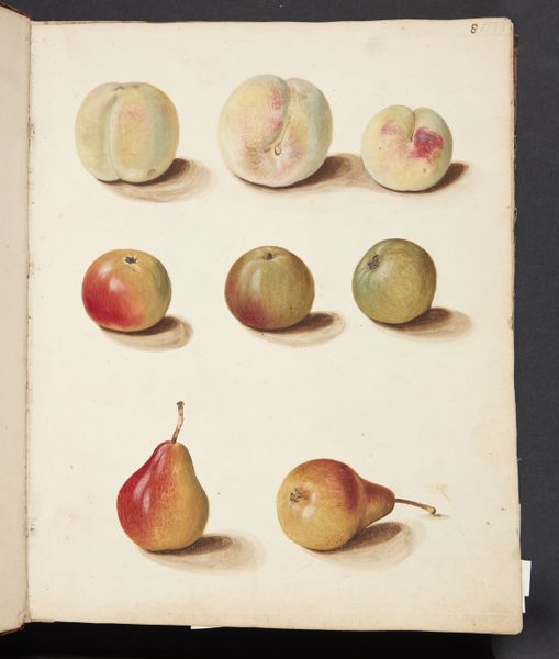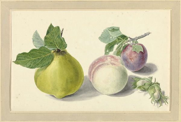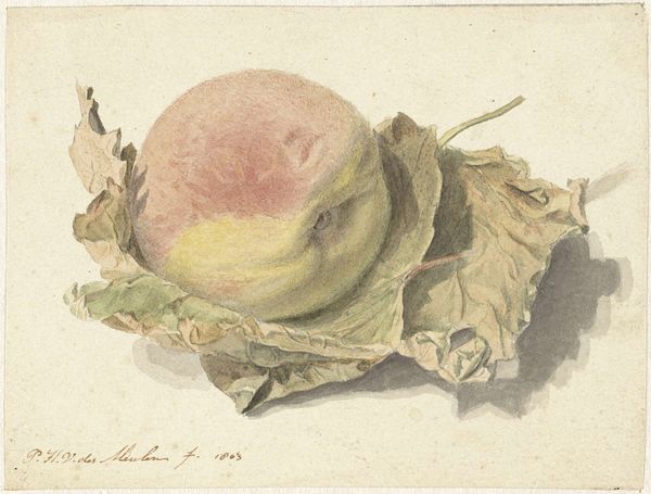 Editor: So here we have Manet's "Two Apples," made around 1880, a colored pencil drawing. They appear to just sit there, bathed in a gentle light. They are commonplace, yet...monumental? What strikes you when you look at this? Curator: The humble apple carries an immense weight. It's tempting to immediately consider the religious connotations—the forbidden fruit, of course, and all the cultural memory surrounding that original bite. But Manet refrains from simple moralizing. He seems to suggest that everyday objects, even these slightly bruised apples, possess their own inherent, almost sacred, value. Do you see that interplay between the real and the symbolic here? Editor: I think so. The realism, in the way he captures the imperfections, keeps it grounded, yet the composition gives them importance. Curator: Exactly. And think about how artists through time have returned to similar images – still lives are a powerful demonstration of skill but also can unlock societal or personal narratives around bounty and decay. Here, consider the brown background and Manet's attention to the round form and muted coloring of the apples. It evokes not just physical presence, but the history held within something seemingly so simple. What feelings are brought up as you spend more time with the drawing? Editor: Well, they now seem less like everyday objects, and more like... relics. Like, you said, holding history. Curator: Precisely. Manet's skill lies in transforming the mundane into something meaningful, asking us to consider the deeper layers of symbolism in the world around us. Editor: I never thought I'd see so much in two apples. I’ll definitely look at still-life painting with a new lens!