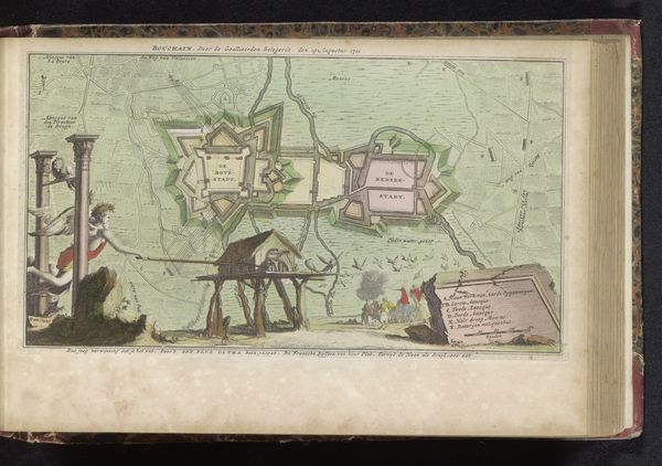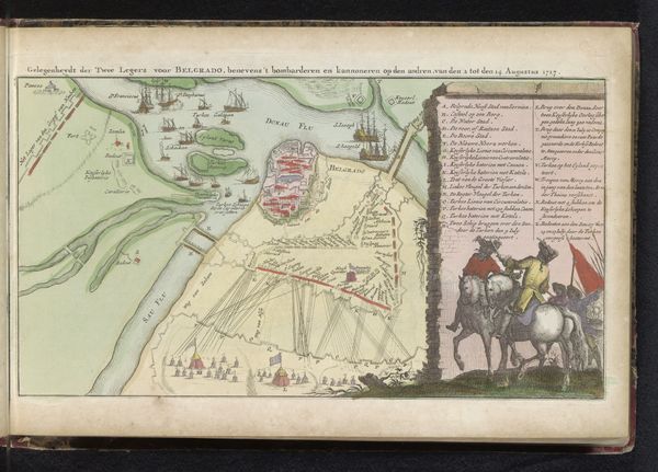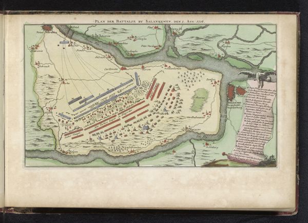 Curator: It is a watercolor from 1735 whose creator goes unnamed; it pictures the "Slag bij Denain, 1712". It seems the Battle of Denain. What jumps out to you? Editor: Well, at first glance, the use of color is quite striking. It almost neutralizes the violence one would expect from such a depiction. The pastel palette gives it a feeling of… distance, I suppose. It makes the historical event appear much more calculated. Curator: Exactly. The cool tones help remove the immediacy, emphasizing strategy. We're seeing not just a battle, but a visual distillation of power relations and imperial ambitions. The various symbols employed—flags, the lion—are deliberately composed. Each color chosen surely relates to faction, land, and, therefore, dominance. Editor: That’s a good point. But what I am also drawn to is how abstracted it is, how it almost looks like a map laid out rather than the lived brutality of a battle scene. What interests me here is how it seems more a technical drawing and, even further, how this drawing comes into being. The watercolor and colored pencil, chosen because they are inexpensive and easy to work, almost speak of an academic practice and, therefore, of the process of control. Curator: True. But remember the purpose. A patron commissioned it, not merely to record the materiality of battle but to solidify and display triumph. This "Battle of Denain," abstracted as it is, serves as a visual reminder of who holds the land. Look at the detailed inking within the lines—such labor! Editor: I see your point; all the same, one element I would love to learn more about is that use of cheap watercolor: why it looks the way it does and what were the means and the access to material at the time it was made? Curator: Interesting point, this colored symbolism, made from mundane materiality…! It challenges my expectations, definitely forces us to revisit these displays of power and victory with more questioning and scrutiny! Editor: Indeed, it all invites us to understand art not just as aesthetic value, but as objects of social and economical understanding, as cultural memory embedded in paint and color.
