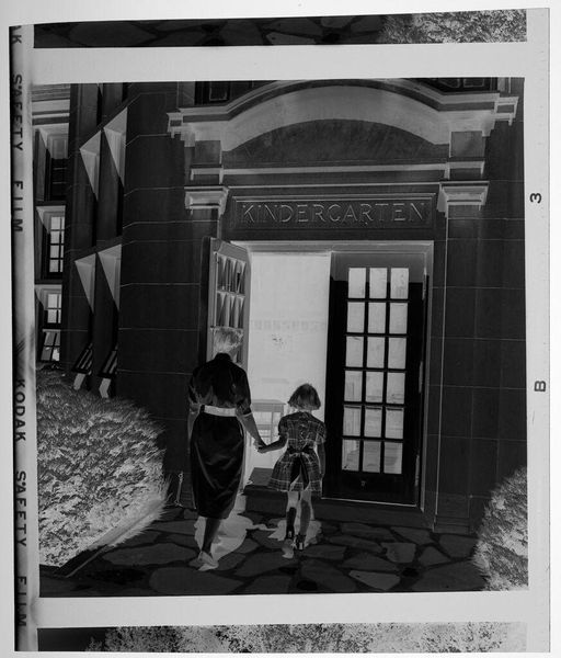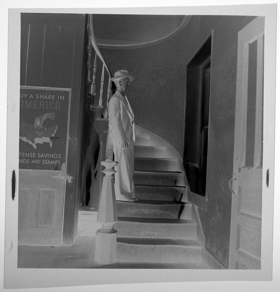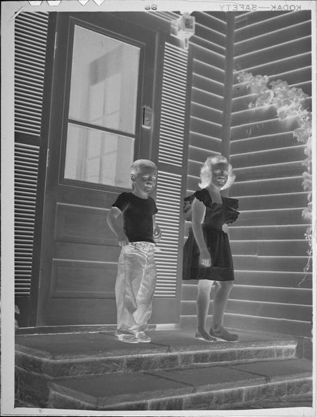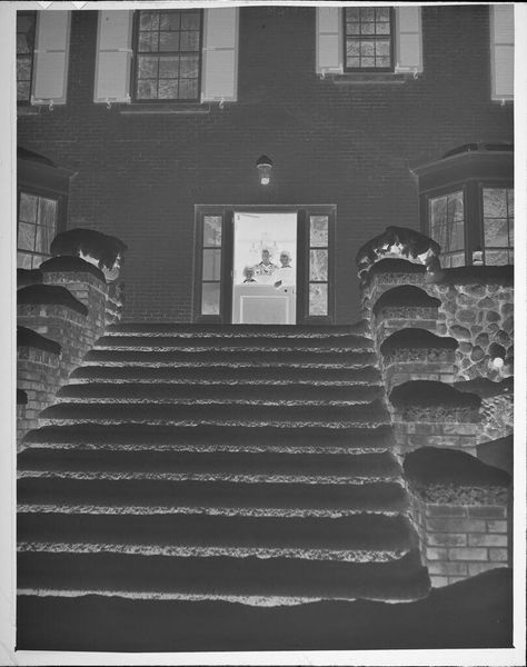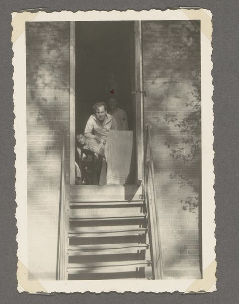 Curator: This is an Untitled work by Jack Gould, though it is sometimes referred to as door to door salesman. It measures just 6 by 12 centimeters. Editor: It evokes a sense of quiet determination, wouldn't you agree? The sharp lines of the steps contrasted against the man, almost swallowed by the composition. Curator: Indeed, the geometry creates a powerful structure. Note how Gould positions the figure ascending, almost like an arrow pointing into the domestic space. The suitcase is wonderfully framed. Editor: The suitcase, a symbol of commerce and perhaps intrusion. It feels like a comment on the American dream, the relentless pursuit of success, even if it means disrupting the peace. Curator: I read it more as a study of contrasts—light and shadow, stasis and movement. The textures also—the brickwork against the smooth surface of the suitcase. Editor: A stark image, both in its monochrome palette and its symbolic weight. It compels us to reflect on the dynamics of aspiration. Curator: It is an interesting capture and arrangement. Editor: Indeed, it is.