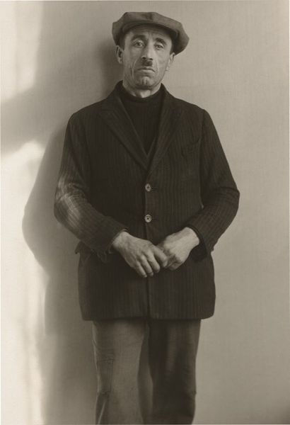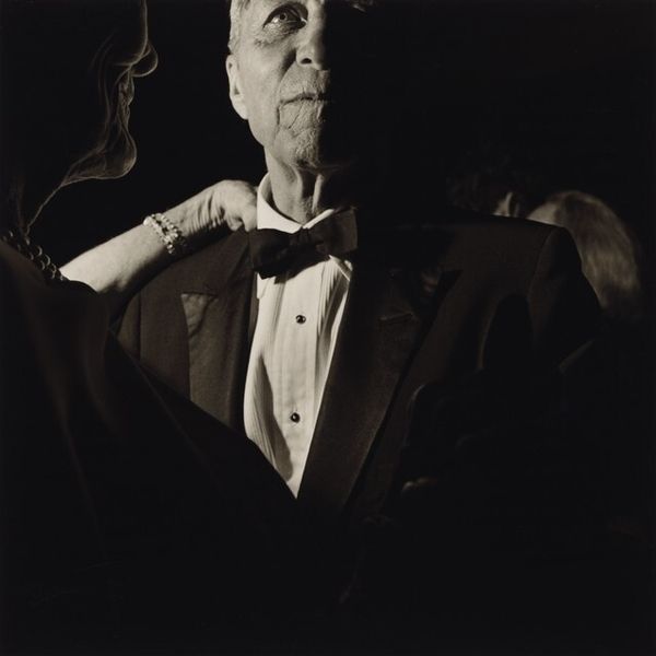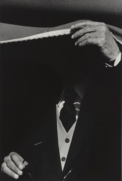 Curator: In front of us is Irving Penn's portrait of Marcel Duchamp, taken in New York in 1948. Editor: The immediate feeling is constraint, isn't it? The subject is quite literally cornered, giving the work a closed-in, almost claustrophobic mood despite its modernist qualities. Curator: Penn was a master of the photographic portrait, distilling his subjects to their essential essence. Positioning Duchamp within this tight corner is, I believe, about exploring the multifaceted layers within the iconic Dadaist's personality. There is vulnerability revealed here, as well as something confrontational in the pose. Editor: The way the grayscale tones fall across the surface creates distinct facets too, don't you think? The shadows accentuate the geometric enclosure, further locking him within the frame, within himself even. Semiotically, this suggests restriction or perhaps the constraints of being a celebrated artist. Curator: And that very concept might resonate with Duchamp's own artistic explorations, no? Think of the readymades, and how Duchamp confronted our definitions and expectations of what art can be. Here, it's as if Penn, through his composition, explores that same paradoxical tension between freedom and limitation. Perhaps the artist, boxed in. Editor: It certainly makes you question that smile, doesn't it? The slight upward turn of his lips amidst the stark lines—is it defiance or resignation? The low key lighting adds a layer of ambiguity, really. A portrait of controlled form with concealed psychological intent. Curator: Absolutely. We find symbols that mirror inner conflicts or contradictions within the cultural memory of an icon, the visual equivalent of wrestling with artistic legacies. The eye travels up along this angular, claustrophobic frame to fix on that wry expression as if to find clues. The portrait certainly sparks thought beyond the confines of the photographic frame. Editor: Penn really plays with geometry to make the psychological tension visually striking. It transcends simply capturing a likeness and starts interrogating something deeper. Curator: Yes, and this is a beautiful study in symbolism of spatial and psychological limitation within the vast career of an iconic artist. Editor: Precisely, and formally we've noticed how cleverly space and line combine, inviting multiple perspectives into the image, even beyond the immediate impression.