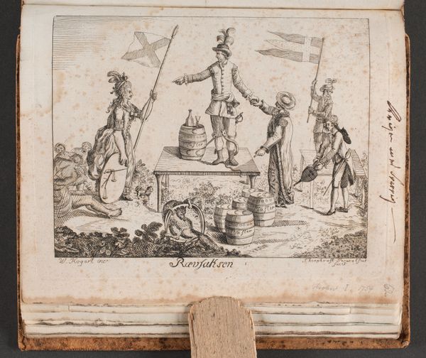 Curator: Well, this looks like an odd stage setting—I'm immediately drawn in by the dramatic arrangement, a world in miniature. Editor: Let's consider this etching and print, titled "Kroemanden" by Gerhard Ludvig Lahde in 1799. It seems rooted in Romanticism, which emphasized emotion and individualism, and there is indeed quite a dramatic composition on display. Curator: Romanticism, certainly. The dreamlike quality and ethereal figures overhead reinforce this, as does the chain looping around the scene, which is at once confining and liberating, drawing the eye inward. Who are these figures? Editor: Lahde uses historical themes often in his work, which offers one possible reading. However, these figures also speak to broader symbolic understandings of fate, justice, and potentially sacrifice within society. The central pair locked in a strained handshake, almost a duel of sorts, feels laden with significance. The judges and a beast bowing low, it's a compelling, if enigmatic narrative. Curator: Note, too, the odd positioning of the harp, almost behind a theatrical curtain. Could it represent the allure of beauty or art itself being somehow distanced from these tense negotiations? It is as though Lahde has compressed history and myth into one potent image, capturing a crucial moment in Danish history and perhaps society. The very deliberate choice of monochrome in this etching enhances the historical feel. Editor: I agree. The lack of color invites a deeper concentration on the form and subject. And the technical skill in rendering the characters’ expressions – a range of power, desperation, and duty – is quite impactful. This artist very consciously selected which elements were placed where, in what quantity and texture, to deliver a layered meaning about societal responsibility and the costs involved. The symmetry itself lends an objectivity, almost a court-like precision in viewing this fictional and imagined encounter. Curator: "Kroemanden," an old term implying something like a man of affairs or a shopkeeper – it’s so suggestive! He is an everyman and represents an individual confronting the intricacies and conflicts inherent in governance. It allows a discourse on historical narrative but at the more human scale of personal emotion. Editor: An exceptional combination of Romantic spirit and skillful construction. A powerful moment immortalized, leaving one to contemplate the play between social constraints and the possibility of individual autonomy. Curator: The formal aspects only elevate those timeless human dilemmas!