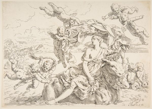 Curator: This compelling ink drawing, executed around 1753 by Giovanni Domenico Tiepolo, is titled *God the Father and Angels Adoring the Madonna and Child*. What's your initial reaction to it? Editor: My immediate sense is one of lightness despite the somber coloration. It almost feels like a fleeting dream caught on paper—the figures seem ethereal and almost weightless. Curator: I see what you mean. The composition is dynamic, with figures arranged in a swirling, upward movement characteristic of the Baroque. Note the carefully placed light and shadow. Tiepolo masterfully employs wash to define forms and create depth, drawing the eye to specific areas like the Madonna's face. The drawing contains this powerful yet understated luminosity and illustrates divine transcendence, as revealed through purely visual techniques, a testament to faith. Editor: Yes, but the process by which Tiepolo arrived at this image also interests me. Consider the kind of labor needed to create this detailed sketch—the repetitive dipping of the pen, the slow, deliberate build-up of the lines. What sort of pigments were available at this moment, and what implications might this medium hold for the piece's portability? Also, to what extent did workshop practices dictate the forms in Tiepolo’s work, as it echoes his father’s better-known painting on the same subject. Curator: Fascinating questions, all of which add another layer of complexity to interpreting the artwork. To go back to our earlier thread, consider the allegorical theme. What significance does it hold to those devout observers that view the piece today? Editor: I believe such sketches are vital documents not only of faith and creative inspiration, but the means by which the message of devotion might have been produced. We are thus brought into consideration of the cultural significance of a work of art—not only the reception of the viewer today, but, by way of art production in 1753, that of devout members of the 18th century. Curator: It’s been enlightening to examine this artwork together, especially in consideration of faith, material history, and, of course, artistry. Editor: Agreed. It's in works like this, particularly Tiepolo’s exploration with material and form, that we can understand the true breadth of devotional artistic expression.