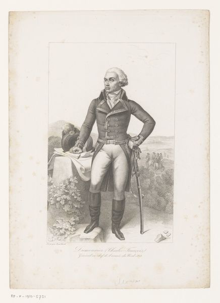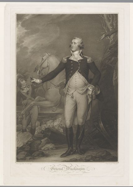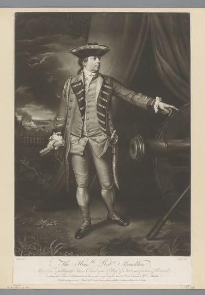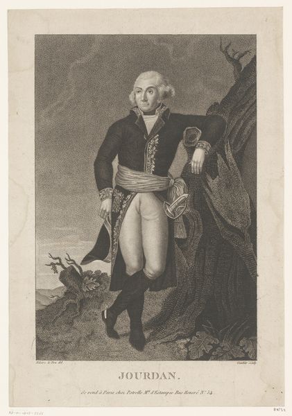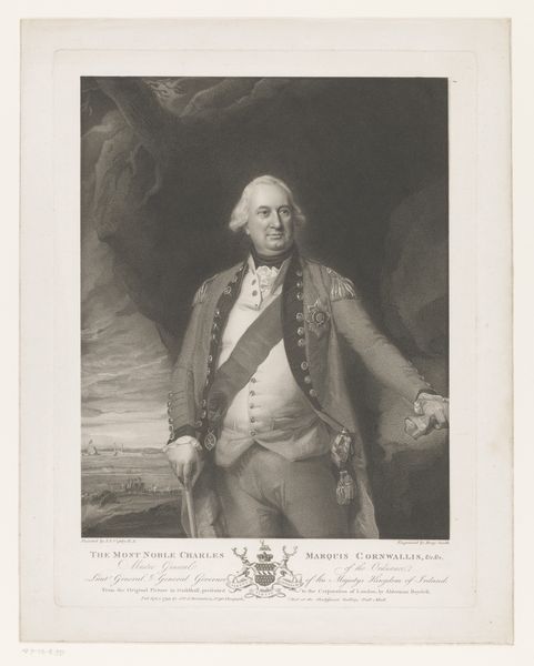 Curator: This is "Portrait of Adam Duncan," an engraving created in 1798 by James Ward. Editor: It strikes me as imposing, and somewhat romantic. The monochrome tones emphasize the rough seas behind him, contrasting the detail of the sitter’s dress. Curator: Absolutely. Ward created this print based on an earlier portrait to disseminate Duncan’s image widely, particularly after his victory at the Battle of Camperdown. Consider the role of printmaking in creating public heroes. Editor: I’m curious about the actual engraving process, since prints allowed for a new sort of consumption of images, but would this have also changed how artisans worked in this period? I mean, engraving plates takes a certain kind of specialist labor, doesn't it? Curator: Yes, specialized labor in this period led to a greater understanding of images being more and more a sort of common thing – less sacred or unique. This print would have been relatively affordable, thus it could be enjoyed by a broad section of society, thus shaping popular sentiment regarding naval power and Duncan himself. The mass production is directly tied to how accessible imagery was becoming. Editor: The print’s mass availability, almost a type of propaganda, played a role in shaping Duncan's legacy. Consider how social and political conditions shape not only what art is made but how it's distributed and received. Do you agree it’s like early social media influencing culture at scale? Curator: In a way, that's right, but unlike algorithms today that tend to change taste more organically, prints offered up concrete political messages. In contrast to painted portraits for the elite, prints became potent political tools shaping British identity during a time of naval dominance. I still think of all that specialist labor required to engrave those lines. The print is not just about image, it's also about manufacturing objects, its a type of industry as much as artistic creation. Editor: This makes one appreciate not only the artistry and production, but also consider the mechanisms through which celebrity and hero worship were cultivated in that era. What a lot to take from a printed portrait.
