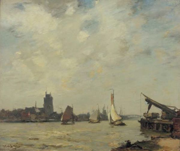 James Campbell Noble created this oil on canvas painting, "Dordrecht," sometime in the late 19th or early 20th century. The painting's composition is immediately striking for its subdued palette and textured surface, evoking a tranquil yet somber atmosphere. Noble's formal arrangement relies on a series of vertical masts and rigging which cut through the horizontal expanse of the water and sky. These create a complex interplay of lines and shapes. The heavy application of paint and visible brushstrokes add a tactile quality, emphasizing the material reality of the artwork itself. The tonal range is deliberately narrow, which invites us to consider the symbolic weight of the scene. In this work, Noble seems less concerned with capturing a literal likeness than with exploring the emotional and structural possibilities of paint. The painting thus destabilizes traditional notions of landscape art, inviting viewers to engage with a subjective experience of place. The painting is less a window onto the world than a carefully constructed object.