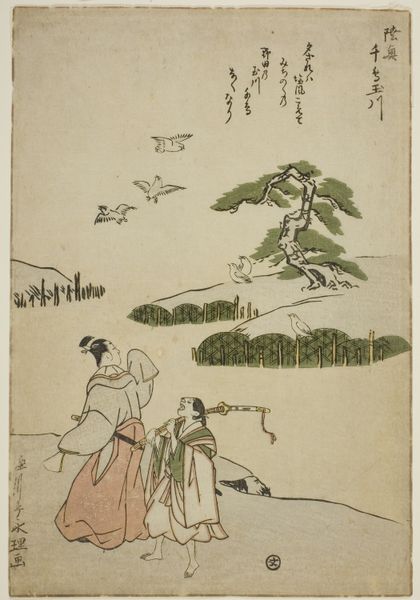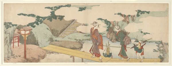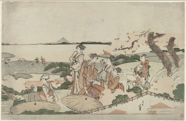 Katsukawa Shun'ei created this woodblock print of court ladies in Japan sometime in the late 18th or early 19th century. The print depicts a scene of leisure and amusement, offering a glimpse into the lives of upper-class women and the gender dynamics of the time. We see court ladies observing a playful scene unfold below, with a woman and a girl chasing a man. This imagery invites us to consider the social position of women in Edo-period Japan, as both observers and participants in the domestic sphere. Were they empowered or constrained by these social roles? To fully understand this work, we might research the conventions of ukiyo-e prints and consult historical records. By understanding the social context, we can appreciate the nuances of this artwork and its commentary on the cultural norms of its time.