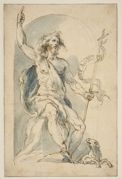 Curator: We’re looking at “Neptune” by Theodoor van Thulden, currently held at the Art Institute of Chicago. It’s rendered with pencil, chalk, and charcoal on paper, characteristic of Baroque draftsmanship. Editor: Immediately, I’m struck by how dynamic it feels for a drawing. It’s as if Neptune’s emerging from the depths, muscles tensed, ready to command the seas. Curator: The composition certainly directs the viewer's gaze upwards, emphasizing his powerful stance and billowing cloak. The interplay of red chalk and charcoal adds depth, highlighting the anatomical precision van Thulden was known for. Editor: Right, that anatomical rendering! And that fierce brow! The textures he’s coaxed from the charcoal create this sense of wild energy—not just power, but elemental chaos. There's also a sensitivity though. You almost forget about the phallic symbolism when caught by the gesture. Curator: Semiotically, the trident is paramount. It signifies Neptune’s dominion and alludes to the threefold nature of his power: controlling storms, calming seas, and commanding all marine life. The medium is also telling: drawing, rather than a more “finished” painting style, perhaps reflects Neptune's volatile essence. Editor: I like that. Volatile essence perfectly captures the spirit of this piece. You expect him to throw it! Not a very calming influence really. This is way more exciting than those statues you see sometimes. What a clever god: an artistic moment of explosive force, captured just before a storm erupts. Curator: Indeed. While its precise date remains unspecified, “Neptune” allows us to appreciate the artist’s deft mastery of line, form, and allegory within the Baroque idiom. The success relies in balancing artistic finesse with allegorical weight, achieving aesthetic harmony through dynamic tension. Editor: Van Thulden makes you feel that the ocean god could just be here in the room—that this drawing isn’t just ink and chalk, but an echo of oceanic vastness. We can almost feel its spray in the air, as the ruler emerges ready to make a big, unforgettable splash.