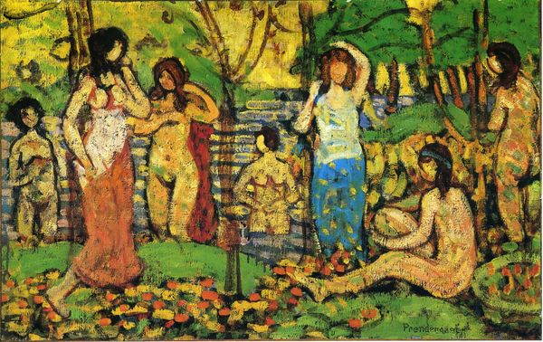 Curator: Painted in 1891 by Camille Pissarro, this oil on canvas work, titled "Haymakers Resting," offers a glimpse into rural life, depicting three women taking a break from their work in the fields. Editor: My first impression is one of quiet exhaustion and sisterhood. The figures, while detailed, seem to blend into the very earth they rest upon. There’s a certain muted color palette, creating a calming and almost dreamlike state. Curator: It’s intriguing to consider Pissarro's social commentary here. In the late 19th century, rural life was undergoing dramatic changes, and works depicting laborers, especially women, held significant weight. They bring attention to a specific gendered division of labor. Do we consider this work through a socialist feminist lens, then, and critique the art market? Editor: I see how this invites us to consider broader societal shifts. And to follow that, if we consider their clothing, there are only minor individualized traits or color selections within them. Beyond practicality, might their clothing express an implied community or collective? Curator: Exactly. The style certainly lends itself to the interpretation, and to a point, their anonymity does raise interesting questions about class, representation, and the male gaze within the Impressionist movement. Pissarro always seemed interested in that struggle to render people as unique, or to blend them into an idea of the times. Editor: Speaking of anonymity, observe the figure in the vibrant red garment. Although her face is obscured from us, the image of a traditional pastoral Madonna comes to mind, but transposed within a secular and quotidian context. The covered head can have a dual meaning of deference and social class at the same time. Curator: And the other two figures’ dresses in paler, earthy blues perhaps indicate a hierarchy or at least a division of labor within the group. It is fascinating to witness this interplay between the symbolism of the garb, the field of labor itself, and their shared place within a cultural history of art. Editor: Thinking of visual heritage, it all coalesces into a potent blend of timeless archetype with localized social awareness, and I'm always struck how art carries echoes of our shared past in these quiet, observant forms. Curator: Precisely. By considering the confluence of class, gender, and social structures in Pissarro’s era, this seemingly serene pastoral scene sparks very profound inquiries regarding those still visible societal divides today.