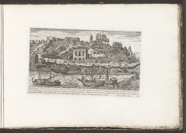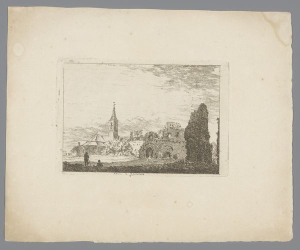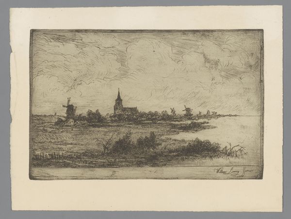 Curator: This etching, entitled "Gezicht op een dorp met kerk op de achtergrond," offers a view of a village with a church in the background. Willem (II) Linnig likely created this realistic cityscape sometime between 1852 and 1890. It's currently held at the Rijksmuseum. What's your initial read? Editor: Well, it feels somber. The muted tones and tight composition create this insular feeling. The linear perspective pulls you into the village, but something about the light feels heavy, almost like impending rain. Curator: Notice the precision of the etching. The line work creates a dense network describing each structure. Think about the labor involved. Linnig wasn’t just representing the village; he was physically working with its image through acids and metal. How does that tactile engagement impact our understanding? Editor: It adds a layer of complexity. The physicality of the etching process, that intricate linework you pointed out, transforms the scene. What appears as a simple vista is actually the result of very deliberate mark-making, repeated action that translates labor into form. Curator: Exactly. The buildings themselves suggest a certain economic reality too. Humble structures closely packed suggest particular living conditions and communal relationships of the time. This etching becomes less about a picturesque view and more about material existence and societal fabric. Editor: That dense application is striking. If we look at it semiotically, the darkness might suggest themes of melancholy and mortality but maybe also of endurance in a close-knit society where the church oversees their daily labors. Curator: An interesting point; however, consider this. Willem (II) Linnig, positioning himself within the Realism movement, attempts to capture and document this tangible setting. He's revealing a specific moment in the landscape, and that depiction would have been immediately accessible, especially to those familiar with the economic struggles it implied. Editor: That's compelling. In the end, it seems we find that, whether reading for visual components, or social factors, these layered perspectives are a powerful entry point for discussing Linnig’s print. Curator: Absolutely. Looking beyond its surface beauty, the artwork’s materiality connects us with the work that constructed the imagery we see here, offering a profound view of a place and the community.