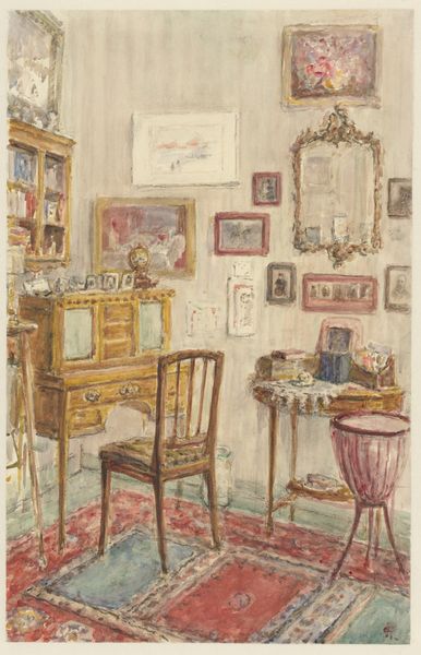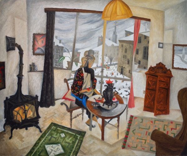Mariam Aslamazian created this oil on canvas painting of her Moscow studio, but it has more to tell us than first meets the eye. Aslamazian has opted for a close vantage point, capturing an intimate and private moment, and one that draws our attention to the tools of her trade. In the foreground we see paintbrushes, bottles, and jars, all necessary in the practice of painting; these tools, and the hand-made art, stand in contrast to the view outside the window, of Soviet Moscow. The visible architecture is imposing, large, and permanent; by contrast, art feels intimate, small, and temporary. By framing art against architecture, Aslamazian may be asking a deeper question about the intersection of art, labor, and society. While the painting gives us a glimpse into the studio, we are made to think about the relationship between art, architecture, and modes of production.