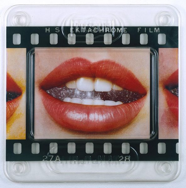 Curator: Well, I'm immediately struck by the jarring juxtaposition of the mundane and the cosmic. It's like a Hollywood smile filled with the entire universe! Editor: Indeed! This is Joe Tilson's "Transparency, Clip-o-Matic Lips". The piece, from the Tate collection, uses mixed media to achieve this effect of Pop Art meets interstellar wonder. Curator: The "Clip-o-Matic" part... it almost feels like a playful take on consumerism. Like beauty and identity can be manufactured. Editor: Precisely. The film strip motif framing the image draws attention to the mediated nature of representation itself, while the glittering cosmos hints at sublime depths hidden beneath the surface. Curator: It’s unsettling, but also, kind of beautiful? Makes you think about all the layers we present and what truly lies beneath. Editor: That contrast, that tension, is where the art lives. I find myself reconsidering how simple surfaces can hint at the complex and infinite.