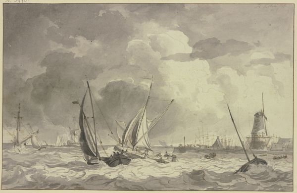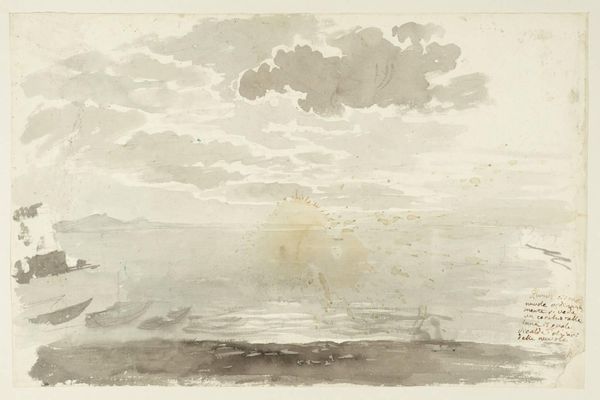 Curator: Clarkson Stanfield's watercolor, "An Eruption of Mount Vesuvius," certainly captures a dramatic moment. Editor: The overall effect is ominous, isn't it? The looming darkness seems to swallow everything below. Curator: Absolutely. The watercolor medium itself allows for this hazy, almost apocalyptic depiction. Think about the availability of these materials—watercolor paints, paper—and how they democratized landscape painting, making sublime spectacles accessible to a wider audience. Editor: And Vesuvius, then as now, is a powerful symbol. Eruptions carry immense symbolic weight – destruction, purification, the unpredictable power of nature itself. It is a cultural memento mori. Curator: It's fascinating how the availability and portability of materials changed not only who could make art, but what kind of subjects they could represent and circulate. Editor: Yes, seeing it this way adds another layer of meaning. Perhaps not just the depiction of disaster, but also a reflection on what we choose to witness and commemorate.