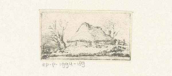 Editor: This etching, "Boerenerf met figuren en hond" from 1777, by Jean-Pierre Norblin de la Gourdaine, captures a rural scene. The texture achieved with simple lines is remarkable! What do you see in this piece? Curator: It's fascinating how Norblin depicts everyday life. Genre paintings like this one gained prominence in the 18th century, reflecting a growing interest in the lives of ordinary people. Consider how art academies at the time were debating what subjects were worthy of representation, a debate infused with class distinctions. Editor: I hadn't thought about the class aspect of choosing everyday scenes! What was the art world's overall reception to this? Curator: There was definitely a market. Prints allowed for wider circulation and appreciation of such scenes beyond elite circles. But remember that Norblin himself had ties to the aristocracy – the politics of who is representing whom, and for what audience, is crucial to understanding the work. The presence of the dog and the rustic setting, seemingly innocent, may be projecting particular social ideals, perhaps romanticizing rural existence for an urban audience. What are your thoughts? Editor: I see what you mean. It's a bit…idealized, maybe? More charming than realistic? That context makes me view the work differently. Thanks! Curator: Precisely. Understanding the socio-political climate illuminates what's being shown and, more importantly, what’s perhaps being deliberately left out. Editor: I'll definitely remember to ask "who" and "why" next time!