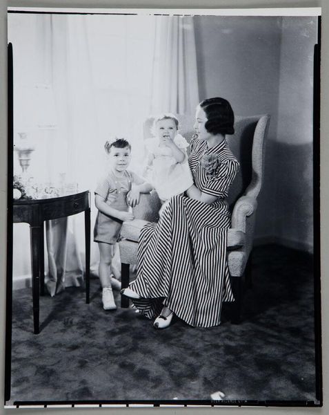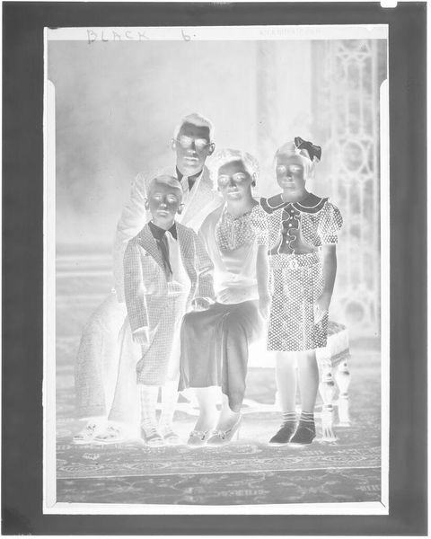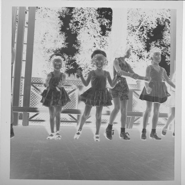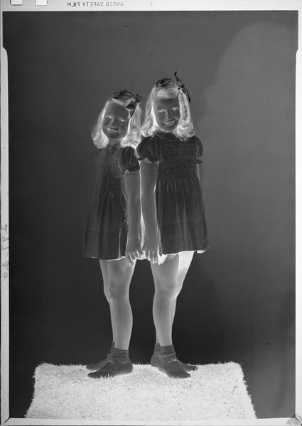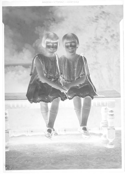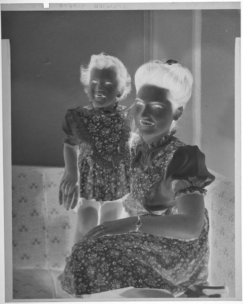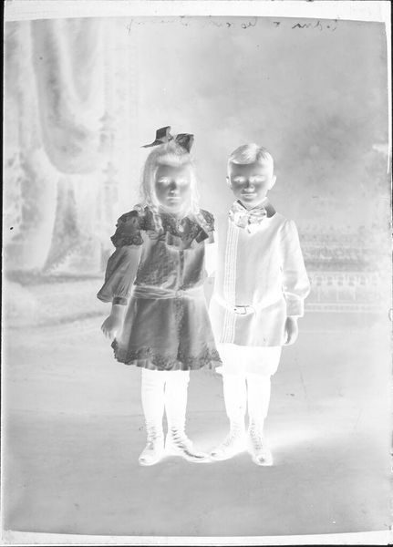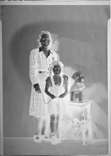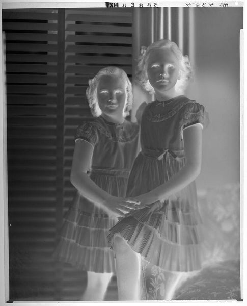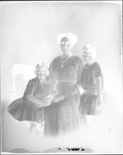 Editor: This is an untitled photograph by John Deusing, featuring three girls in what looks like a studio setting. It has a rather ghostly feel because of the inverted tones. What do you make of it? Curator: It's like stepping into a faded dream, isn't it? The photographic negative lends it an ethereal quality. The girls, frozen in time, become almost spectral figures. Do you notice the subtle differences in their dresses? Editor: Yes, the textures are quite distinct. What do those details tell us? Curator: Perhaps about individuality even within a formal portrait. Or maybe about the unique personalities that shine through even the constraints of posing. Each girl a universe. Editor: That's a beautiful way to put it. I appreciate how you drew attention to the small details that really give the image character. Curator: And I'm so glad you noticed them too. It’s in those quiet corners where art truly whispers to us.