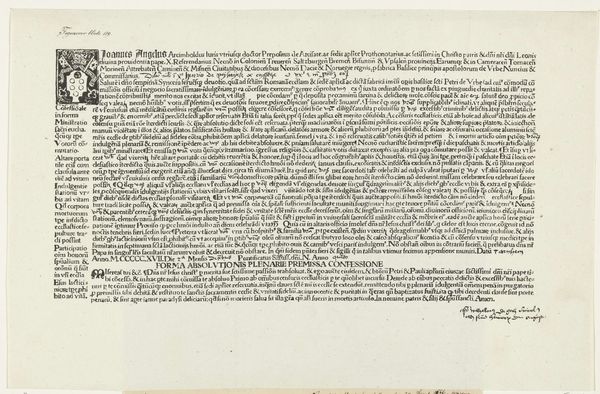 Editor: Here we have a page from Pietro Paulo Tozzi’s "Ghirlanda: Di sei vaghi fiori scielti da piu famosi Giardini d'Italia," created in 1604. It’s a drawing, or perhaps a print, showcasing elaborate calligraphy. The density of the text is striking, creating an interesting visual rhythm, even if I can't read it all. What do you see when you look at this page? Curator: As a formalist, the symbolic meanings of the text hold less interest than the pure visual experience. Note how the density of the script, contained within the ornate floral border, creates a self-contained world. This framed density yields a balanced composition, but what tensions arise within that balance? Editor: I guess I see how the floral border almost fights with the rigid text… one ornate, one regimented? Curator: Precisely. There's a dialogue between the organic and the structured. Consider the way the letterforms themselves become abstract shapes, lines in constant contrast against the white of the page, creating shadows with texture to activate this field of inscription. The eye dances between legibility and abstraction, order and chaos. Do you see any significance to that contrast? Editor: Hmm, maybe the rigid text represents knowledge and structure, while the floral border alludes to the beauty of the natural world framing and supporting such information? Curator: An interesting reading, that integrates content. But focus now simply on what you are seeing. The contrast does evoke this. Editor: I see how limiting analysis strictly to the formal aspects encourages a slower, deeper consideration of visual components. The framework pushes me to explore the relationships between the shapes and patterns on the page rather than immediately seeking out historical context or artist intent. Thanks!