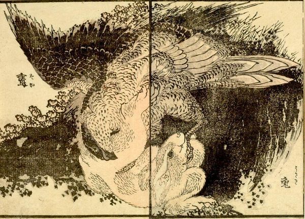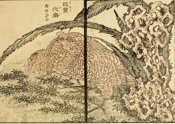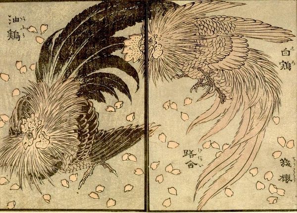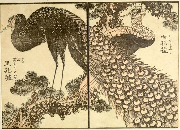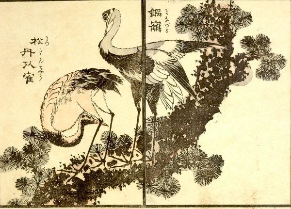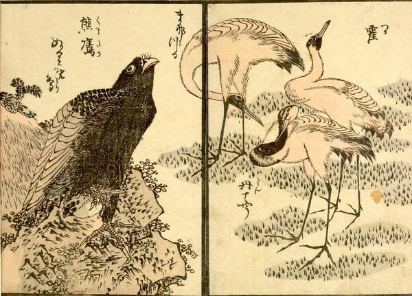 Editor: This is a woodblock print from the illustrated book "Kacho Gaden" by Katsushika Taito II. The contrast between the dark and light birds is striking. What do you make of this composition? Curator: The interplay between light and dark birds can be seen as a commentary on social hierarchies within the Edo period. Consider the symbolism of birds in Japanese art; they often represent freedom or conversely, confinement. How might these ideas interact with the socio-political context of the time? Editor: That's a really interesting idea; I hadn't thought about the social commentary. Curator: It is fascinating how art can reflect the social issues of an era, isn't it? Editor: It is! It gives me a new perspective on art and its role in society.