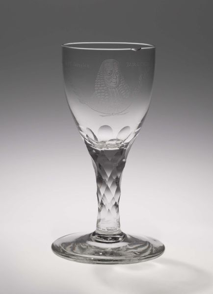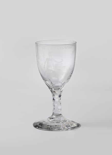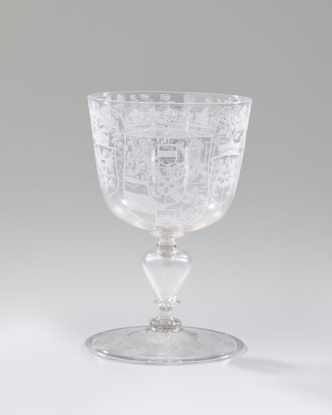 Editor: This is an engraved glass vase from 1856. The Rijksmuseum attributes it to an anonymous artist. What's striking is that it's inscribed with the lyrics from "Wien Neerlandsch bloed," the Dutch national anthem. It’s interesting to see how text is part of its material make-up and surface, instead of merely adorning it. What do you see in this piece beyond its aesthetic appeal? Curator: Well, placing emphasis on process, observe how engraving transforms a utilitarian object – a glass vase – into a vehicle for national identity. The act of inscription is labor-intensive, turning glass, an industrial material, into a repository of cultural memory and collective sentiment. Editor: That makes sense. The text seems almost fragile, almost contrary to the clear strength of glass, which might be the point. Curator: Precisely. Consider how this contrasts with industrial modes of production that proliferated in the 19th century. We're looking at craft being intentionally placed in service of national symbolism. How does the function of a vase for holding flowers shift when overlaid with text that’s about nationalism? Does it become purely decorative, or does it still serve a purpose? Editor: Perhaps it elevates something as everyday as flowers into a symbol of national pride? I hadn't thought of the labor involved in its creation, and how the glass, plus the craft act against industrialized glass production methods. Curator: Right. Reflect on the relationship between craft, consumption, and patriotism. Was this vase intended for everyday use, or display? It pushes us to reconsider craft’s socio-political function, beyond simple artistry. Editor: That's really fascinating, viewing its construction as more than decorative art and more as a production reflecting nationalist sentiment. Thanks for pointing that out. Curator: Absolutely, by examining materiality, we unlock rich perspectives on a nation's evolving sense of self.