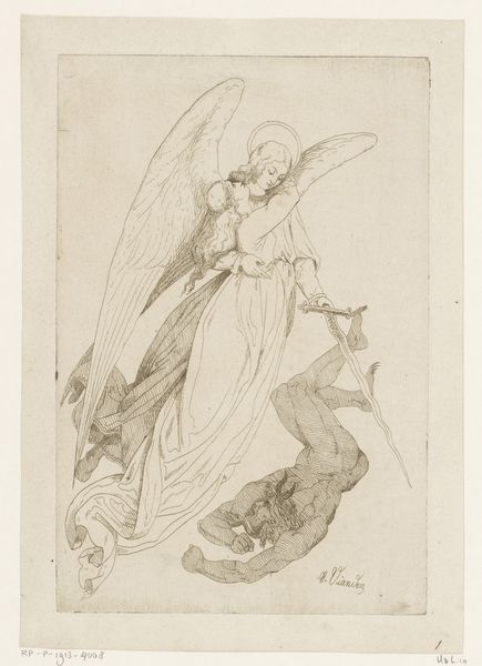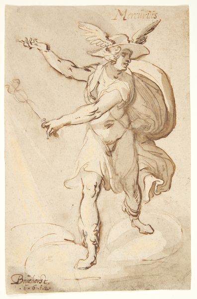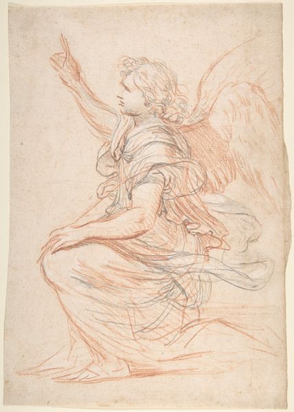 Curator: This delicate work, titled "Standing Angel Brandishing a Sword," comes to us from Ferraù Fenzoni, made sometime between 1585 and 1595. It's a compelling drawing in pencil, showcasing a winged figure poised with a weapon. What’s your first impression? Editor: It feels like a preparatory sketch, a flurry of lines capturing movement. The focus seems to be on the folds of the drapery, the weight of the fabric itself, more so than a polished, finalized form. Curator: Absolutely, you can almost feel Fenzoni experimenting with the composition. I’m struck by the recurring motif of the angel wielding a sword. In Renaissance art, angels were often symbols of divine justice and protection. Consider Saint Michael. Editor: I’m interested in the artist’s decision to use pencil. It creates a softness, a certain approachability. It doesn't have the permanence of ink or the gravitas of paint. Is it simply an economical choice, or is the relative ease of working with this medium informing the image-making process? Curator: The immediacy of the medium definitely contributes to its character, its unfinished and evolving qualities. However, consider the socio-political context of late 16th-century Italy: Fenzoni, an Italian painter during the late Renaissance, might also have aimed to communicate faith through this image. Editor: So the act of rendering the divine, of choosing specific, earthly materials… what does that say about our engagement with the spiritual world? The accessibility of the medium democratizes the image, bringing the angel, and by extension, the concept of divine protection, closer to the individual. Curator: I see what you mean. And consider how Mannerism— a core ingredient of this work, after all—revels in elaborate forms and elongated figures. Does that inform your thoughts? Editor: Precisely. Mannerism favored artifice, so a medium like pencil seems fitting. It acknowledges the work involved, foregrounding human agency rather than attempting to disguise the labor and processes involved in creation. Curator: Looking closely at it one last time, I feel how, through these deliberate decisions, this angel and the sword become symbols, not just of protection but of hope, maybe even a promise of redemption in a turbulent time. Editor: Yes, it moves beyond mere iconography; Fenzoni's artistic decisions— pencil work and all—emphasize a message accessible to all. The choice isn't arbitrary but essential to the impact the image makes and to the stories it aims to tell.