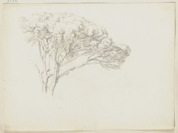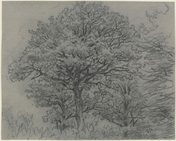 Curator: Look at this ink drawing, "Studie af træer. Classens Have" or "Study of Trees, Classens Have" rendered in 1898 by Joakim Skovgaard. A simple yet striking image. Editor: It certainly grabs the eye with its stark simplicity. All that intricate hatching gives the tree a palpable weight, almost a melancholic feel. Curator: It’s fascinating to see Skovgaard, known for his monumental religious frescoes, engaging with such an intimate subject. This piece reveals another side of his artistic practice, more personal and observational. The Classens Have, a public park, offered a respite amidst urban life. Its creation reflected changing societal attitudes toward leisure and accessible green spaces. Editor: Yes, those layers of ink seem to build more than just the tree. There is a quality, as if Skovgaard is less representing, and more communing with its essence. Trees have been central in art throughout human history. Often embodying life, resilience, interconnectedness. Curator: And notice how the density of lines shifts. Where it’s more controlled in the foliage and looser around the base suggesting different forms and textures, mirroring Skovgaard’s connection to both naturalist artistic circles as well as emerging symbolic idioms. Botanical illustration at the time played a significant role, blending scientific accuracy with aesthetic appreciation for the natural world, reflected here. Editor: It reminds me of the Romantic painters—this intense observation feels like an effort to understand something fundamental, not just about botany but about existence. Curator: Precisely. It captures the cultural moment—a yearning to reconcile industrial progress with nature. The drawing becomes an archive of artistic and cultural tensions from turn-of-the-century Denmark. Editor: And by concentrating our vision so intently on a single tree, the artwork invites reflection on ourselves. Perhaps we are to find a symbolic bridge to what sustains us too. Curator: Indeed. It’s rewarding to view how a simple sketch made over a century ago allows us to contemplate the enduring symbolism and relevance of nature and our role within it. Editor: This piece reminds me that enduring art does not always demand complexity but offers new vantage points for what is right in front of us.