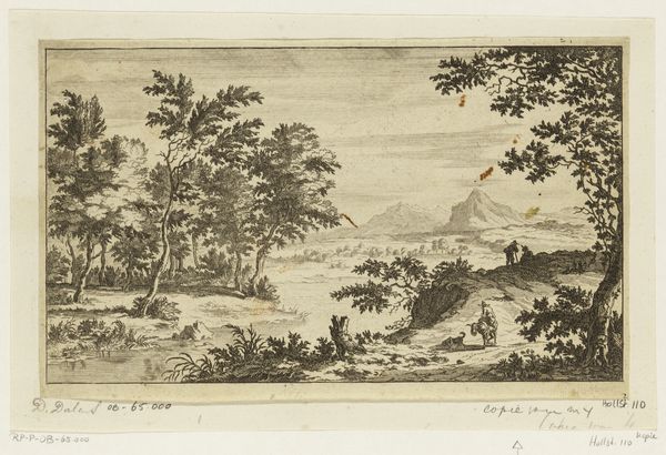 Curator: Thomas Cole's "Study for 'The Mountain Ford'," created in 1846 using pencil on paper, invites us into a serene yet powerful natural setting. What is your immediate reaction? Editor: It feels like a memory, a whisper of a landscape. All these grays...it’s nostalgic, like an old photograph tinged with longing, evoking a subdued atmosphere, doesn't it? Curator: Absolutely. Cole, as a leading figure of the Hudson River School, was deeply invested in the dialogue between nature and culture, especially the impact of colonialism and industrial expansion on the American landscape. This work captures a pivotal moment in that relationship. The lone figure on horseback appears diminished by the scale of the landscape, highlighting the tension between human activity and natural grandeur. Editor: You're right; the human element IS tiny. Almost overwhelmed by the ancient tree and the looming mountain. And what about the fording of the river? Fording suggests both obstacle and journey—it really emphasizes this constant movement. There’s also something very American about the rugged individualism it projects! It kind of pulls me in as a viewer to reflect on where it's going, where it has been... I like that. Curator: Indeed. Consider also that Cole frequently used landscapes to convey moral and historical narratives. By focusing on untouched wilderness, Cole's imagery carries implications concerning manifest destiny and American identity formation, often representing a critique of then-contemporary social values and imperial pursuits, doesn’t it? Editor: Totally! Thinking about it more, the monochrome contributes powerfully. Removing color refines the landscape to light, shadow, texture—almost hyper-real somehow, distilling the raw elements to what is essential, which maybe helps with those cultural observations! Curator: I agree. In a world grappling with climate change and the legacy of environmental exploitation, this work also feels deeply resonant, doesn't it? It encourages us to confront our own relationship with the natural world and to consider the ethics of our actions. Editor: Looking closely I notice now the way light glints on the distant crags…that distant shimmer is quite evocative. It definitely adds to the feeling that it asks hard questions! It feels almost ghostly. Thank you, Thomas Cole, for conjuring such an experience from just a few pencil strokes! Curator: This drawing challenges us to confront the environmental, social, and existential implications embedded within our relationship with the natural world.