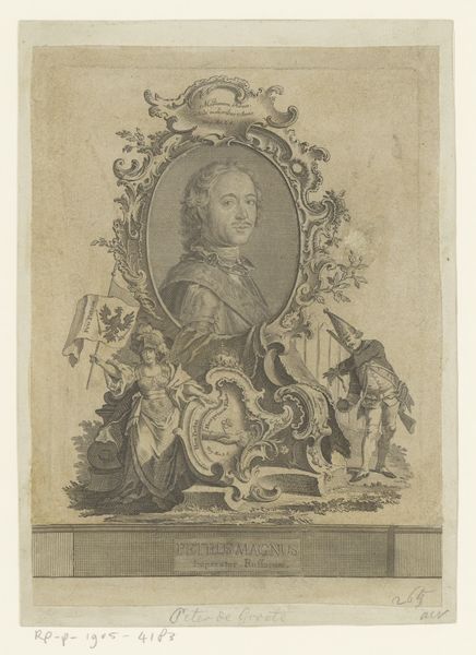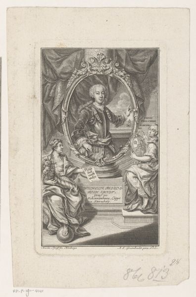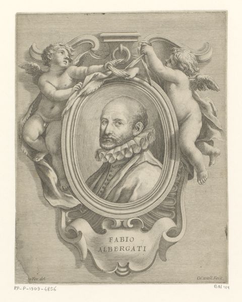 Editor: So, this is "Portret van schermmeester Angelo Viggiani," from 1575. It depicts, well, Angelo Viggiani. What stands out to me is how ornate the frame is; it almost seems to overshadow the subject. How do you interpret this work, keeping in mind the time it was created? Curator: Consider the printmaking process in 1575. Engraving demanded specialized skills, and consequently, the image’s distribution hinged upon workshop structures and the economic value placed on artisans' labor. Look at the intricate details - the vases, the figures flanking the portrait. These weren't simply decorative choices. They represent the economic investment into the *making* of the portrait. The very act of commissioning and producing this portrait reinforces Viggiani’s status through consumption and displays his financial capabilities to purchase and disseminate a rendering of himself. Editor: So, it’s not just a portrait, it's a display of wealth and a kind of advertising through material culture? Curator: Precisely. Think about the cultural context of fencing masters during that time. They held unique positions, not quite nobility, but essential for training nobles. This print elevates Viggiani into that upper class, associating him with the material signifiers of that group, achieved through labor. How readily available do you think these types of artworks would have been? Editor: I imagine only those with some power and social reach had portraits created about them. It gives me a fresh perspective, and it really highlights the historical implications in the use of this medium! Curator: Exactly! I appreciate how you have picked up on the social impact embedded in the labor-intensive production of images like these.