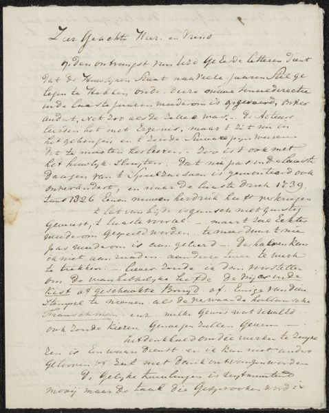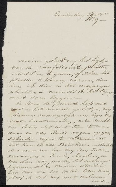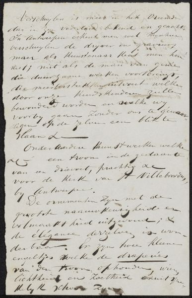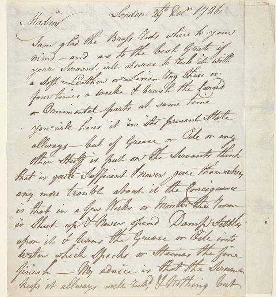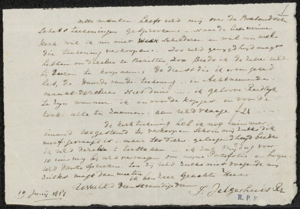 Editor: So, here we have an intriguing advertisement, or 'Advertentietekst', for Johannes le Francq van Berkhey's "De Politieke Hollandsche Koemarkt," created in 1787. It's a pen and ink drawing on paper. Honestly, it mostly looks like a page of beautifully handwritten text. What can you tell me about it? Curator: The initial impression is one of intricate detail, yes. Think about how calligraphy itself functions as a symbolic language. Every flourish, the weight of each stroke, contributes to a message far beyond the literal words. What feeling do you get from the overall impression of the writing? Editor: I guess... official? There's a formality to it. But what's the text actually about? What were they advertising? Curator: Exactly. Consider the Dutch Golden Age: there was huge investment in scientific understanding through the detailed study of what's there, and even what is *seen*. They had the ability to use their new tech (lenses, printing) to get an exact image into other peoples hands, at their command! And because their world was their oyster due to Dutch trade dominance, images suddenly held great currency because of the potential power they brought to bear for those in Europe or in Asia, at home and abroad. With the use of the tag of *Genre Painting*, this artwork invites a further dive into understanding how that looks when rendered plainly. Editor: Ah, I see. So even the *act* of producing such a detailed, calligraphic notice signaled a level of importance and wealth. Thanks! I wouldn't have picked up on all that by myself. Curator: The act of documentation becomes imbued with value in itself. So it seems that something as straightforward as marketing of *Koemarkt*, of trade for things to *come to market*, makes this artifact particularly complex now.
