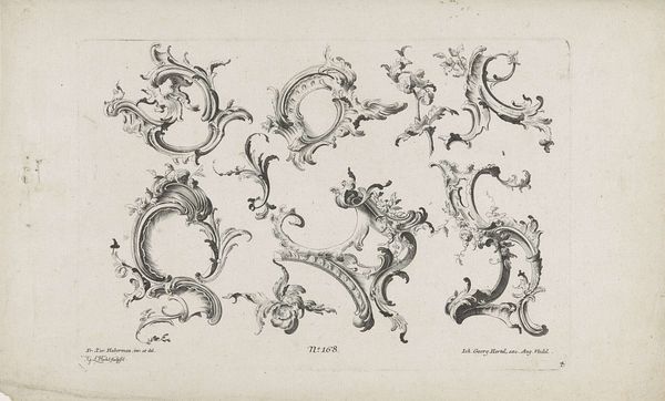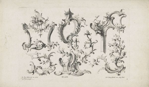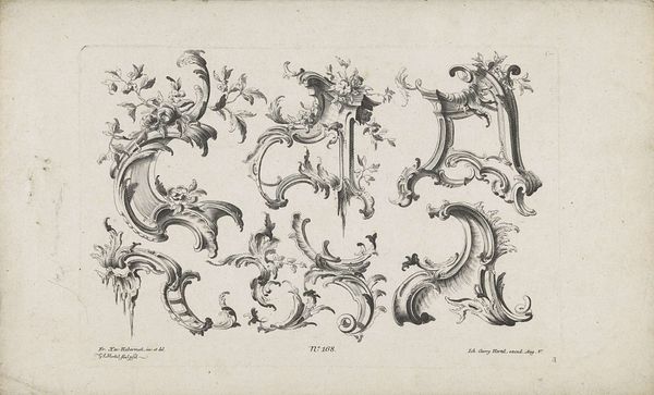 Curator: Well, hello there! Today, we’re looking at "Voluut- en bladvormige rocaille-ornamenten," which translates to Volute and Leaf-shaped Rocaille Ornaments. It's a drawing by Johann Georg Hertel, created sometime between 1727 and 1775. You can find it here at the Rijksmuseum. Editor: Ah, immediately I'm seeing whimsy. The whole composition feels light, almost playful, doesn't it? Like a little dance across the page, all curves and flourishes. I can almost hear the harpsichord music accompanying these shapes. Curator: Absolutely! These ornaments exemplify the Rococo style, with its emphasis on asymmetry, elegance, and the natural world. Notice how the volutes and leaves, the key visual motifs, are stylized and flowing. These motifs had symbolic importance, representing vitality and the endless cycle of growth. It echoes a certain optimism inherent in that era. Editor: Optimism laced with powdered wigs and courtly intrigue, maybe. I love how these drawings, despite their age, possess a kind of immediate energy. There’s something so intimate about sketchbooks; like catching a glimpse into the artist's private thoughts as they toyed with different forms. Curator: Indeed! You feel that Hertel used pen and ink in a very exploratory way. Artists like Hertel utilized these motifs as building blocks for larger decorative schemes—think furniture, architectural details, even silverwork. These seemingly minor drawings provided a visual language, helping to transmit ideals of sophistication across society. Editor: They're a visual shorthand for opulence, aren't they? Each little curlicue practically screams, "Look at me! I am tastefully expensive!". There’s an echo of that theatricality still alive in design today – maybe it’s a human instinct, this drive to ornament and embellish our surroundings. Curator: Yes, ornamentation helps carry a cultural memory. The very act of replicating and adapting these shapes connected the artisan to a lineage of skilled craftsmanship, reinforcing shared values. Editor: That’s it, it is a historical through-line – this constant desire to find visual pleasure in design. Thanks for letting me muse on it! Curator: My pleasure, such exploration has enriched our understanding today.