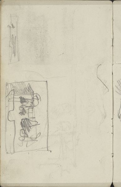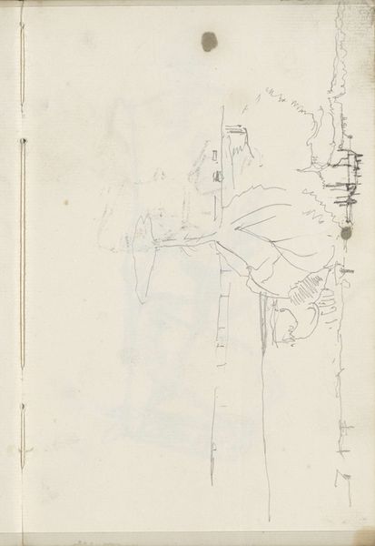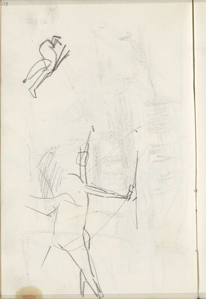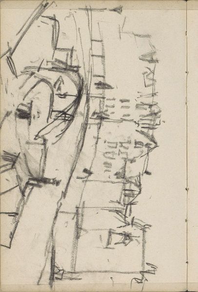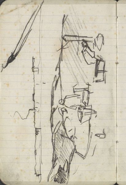 This is George Hendrik Breitner's drawing, "Figuren op een brug," held at the Rijksmuseum. The sketch, rendered with graphite on paper, captures figures on a bridge with a striking emphasis on form and spatial arrangement. Breitner divides the composition into distinct zones using the verticality of his line work. The blank space on the left serves not as emptiness but as a structural element, juxtaposed against the density of the figures on the right, creating a dialogue between presence and absence. The figures themselves are rendered with an economy of line, almost cubist in their geometric reduction, challenging traditional representational norms. The structural interplay between the sketched figures and the open space destabilizes conventional perspective, inviting viewers to negotiate the spatial dynamics. This challenges our perception and highlights the artwork's formal exploration over narrative clarity.