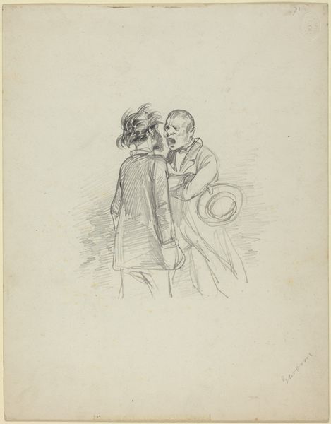 Curator: What a captivating scene! This etching, created by Sir John Everett Millais in 1852, is titled "Mr. Wray's Cash Box; or, The Mask and the Mystery" and resides here at The Art Institute of Chicago. Editor: It's quite stark, isn't it? Almost severe in its simplicity. I'm immediately drawn to the contrast between the dark lines defining the figures and the blankness of the background. The artist's choices regarding paper material and etching technique, how they have aged since 1852, are significant, but what was the access to these raw materials and specialized artisan know-how at that time? Curator: The austerity certainly mirrors the Pre-Raphaelite's ethos. They sought a return to what they considered the sincerity and simplicity of pre-Renaissance art. The mystery suggested in the title must refer to something societal since their compositions reflected not only painterly innovation but also social awareness. Do the two figures symbolize a form of oppression or suppression? Editor: I think the production techniques used play an important role in understanding this, though. As an etching on paper, prints were intended for dissemination. Its potential availability enabled commentary and circulation throughout England's socio-economic classes. Perhaps a sign of new roles for artists like Millais during that transformative moment in time. What are they saying about production within the British machine? Curator: Indeed, the affordability of prints democratized art, enabling social commentary on a broader scale. Millais was part of a new generation exploring art's role in societal discourse. Perhaps these seemingly regular figures point to broader issues like class and economic struggles prevalent within English society and those pressures played out in people’s real lives. Editor: The materiality is quite powerful here as the simplicity allows the story being presented, including who has access, who could reproduce or circulate the artwork, to add layers of potential analysis. I wonder how access to cash-boxes like this were socially constructed too. Curator: This piece invites us to look beyond the surface, delving into Victorian England's social fabric through the lens of these skillfully etched lines. Millais' social observations have secured his influence in romanticism for centuries. Editor: Agreed. "Mr. Wray's Cash Box; or, The Mask and the Mystery" pushes us to understand this work, through technique, history, social commentary and perhaps its largest success may stem from Millais' masterful employment of print and etching processes.