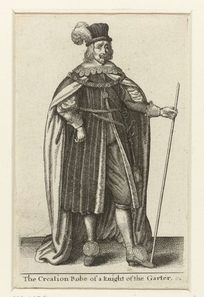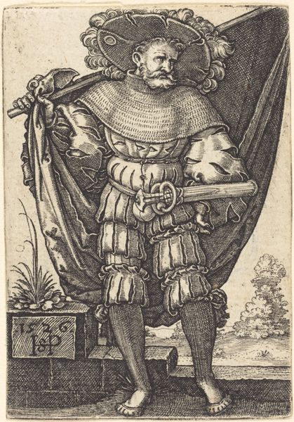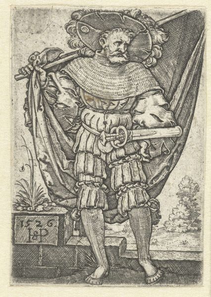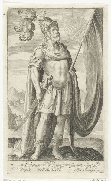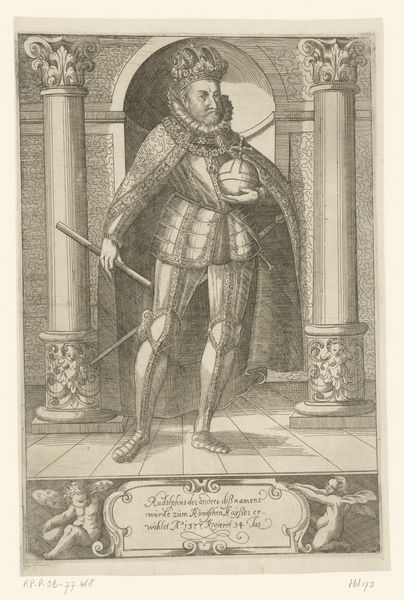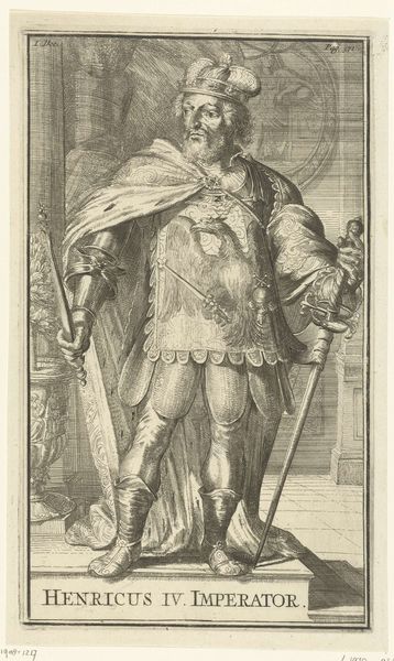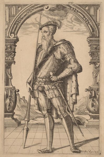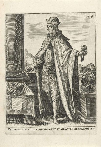 Curator: Here we have Philips Galle's "Portret van Karel de Kale," an engraving dating back to 1603, now residing here at the Rijksmuseum. What strikes you about it? Editor: The steeliness, the literal armour plating! He looks like he's ready for battle, or at least posing to suggest such readiness. There is very little vulnerability here, this is an image meant to project strength, dominance, and, of course, the authority of a monarch. Curator: Precisely. This isn't just a portrait; it's a statement. Galle was known for his engravings that circulated widely, shaping perceptions of historical figures. The context is crucial here; consider the power dynamics of the era, the role of monarchs, and how these images functioned as propaganda. Editor: Propaganda, absolutely. Think about how carefully this image would be curated, who gets access to it, and the message that's being deliberately conveyed. I wonder about Charles the Bald himself – did he have any agency in how he was depicted? Curator: Galle created this work centuries after the death of Charles the Bald. It's about constructing an image of power in a very specific early modern context. We see the fleur-de-lis motif, a powerful identifier. It's fascinating to consider the political forces at play when crafting and disseminating imagery such as this. It's also worth noting the landscape in the background and the symbolic items around him: a sword, the shield and the column. Each item is supposed to enhance the impression of kingship. Editor: All these strategically positioned details amplify an ideal. We need to also interrogate the visual language of power—the semiotics, even—embedded in something seemingly straightforward like this. It is about historical context, as you say, but it's also about critiquing those power dynamics, unveiling the inherent ideologies being promoted and who they're excluding. This is about interrogating historical image making. Curator: Indeed. What seems like a simple depiction is actually a dense tapestry of social and political intentions. The distribution networks also affected perceptions. Images could legitimize claims to power but also become the focus for critics in broadsides and satires. Editor: Yes, the meaning of this artwork lives as much in the context of its time as in what we can glean about our own through interrogating images such as this today. Curator: Looking closely at pieces such as this also gives us great insights into printmaking and how social messaging would move through society in early modern Europe. Editor: And for me, it challenges us to unpack power— who is represented, who is left out, and what unspoken rules exist within these images from history?