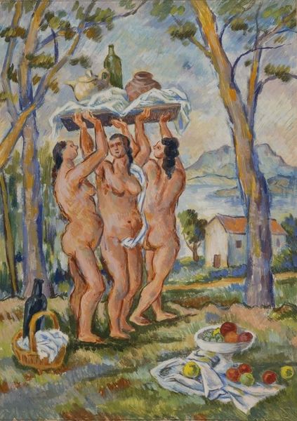 Curator: Here we have Paul Cézanne’s "The Large Bathers," a truly monumental work even if the exact date of its creation remains a topic of discussion amongst scholars. Editor: My first impression is how solid they feel, monumental indeed, as if he’s constructed them from the earth itself with each figure having this weighty presence. Curator: And that's exactly what Cézanne was after— a new form of realism that he described as durable. He moved away from impressionistic ideals to look at shape, volume, and depth to build up form through layers of color. Editor: I see what you mean, and notice that almost tactile feel with the layers of paint in how the nude bodies contrast against that more loosely rendered landscape with visible brushstrokes. Curator: Precisely. And this piece, along with others in his 'Bathers' series, really challenged the established Salon conventions. This pushed figuration toward abstraction and abstraction toward representation which greatly influenced later avant-garde movements like Cubism and Fauvism. He was disrupting art's expected norms and values. Editor: Considering the constraints imposed by academic expectations on representations of the body during that era, focusing so heavily on its material form could almost be seen as subversive. This reminds us how even idyllic or pastoral paintings become arenas of cultural negotiation when labor and production methods take the fore. Curator: A really key observation because the art market favored these polished, finished pieces, yet Cezanne leaves the traces of his process visible. That disrupted traditional notions of artistic skill, pushing against elitist standards that deemed art 'high' or 'low.' Editor: Indeed. These works aren’t merely paintings; they’re manifestations of process that are integral to experiencing them. Each impasto brushstroke testifies to human endeavor. Curator: Thinking of the broader cultural moment, 'The Large Bathers' prompts fascinating inquiries into how artistic expression and broader social forces interact, providing a view of the evolution in how paintings were consumed and critiqued. Editor: Yes, from a material perspective, seeing how brushstrokes translate to the building blocks gives us more insight into our artistic process as a society during Cézanne's life. Curator: Exactly! I think understanding his legacy reminds us that art is not produced in a vacuum and neither is art’s consumption. Editor: And this detailed discussion reaffirms how even within single works the multiple possibilities emerge given where we place focus be it socio-cultural elements or an appreciation rooted strictly through making practices and processes.