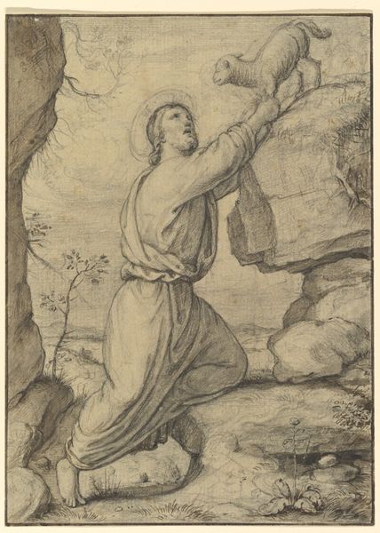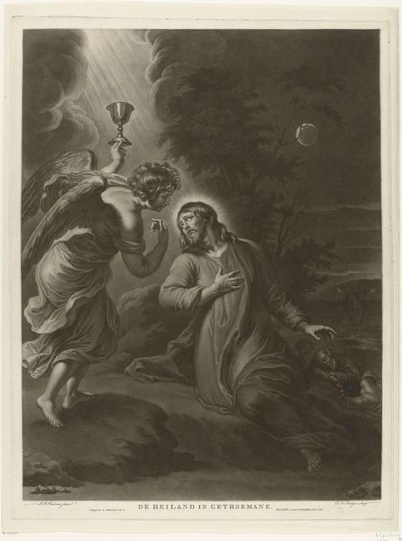 Curator: We're looking at "Christ in the Garden, from The Passion of Christ, plate 7," an engraving created by Grégoire Huret in 1664. It's part of the collection at the Metropolitan Museum of Art. Editor: Oh, wow, talk about dramatic lighting! It's so Baroque; all that stark contrast really grabs you. A real spotlight effect on Christ. Heavy stuff. Curator: Indeed. Huret employs a distinct linear style, characteristic of engravings, to construct the scene. Observe how line weight and density model form and create a sense of spatial depth, despite the monochromatic palette. Editor: It's funny though, even with all the detail, it feels kind of… dreamlike? Like a memory half-forgotten. Is that angel really floating there with a teeny cross, or is Christ just imagining it? Maybe that's the agony—the weight of what's coming bearing down, personified as this floating figure. Curator: The angel, carrying the cross and the chalice, acts as a divine messenger, a symbol of the impending sacrifice. Huret uses the conventions of the Baroque period to visualize religious narrative, but in keeping with the academic style known as ‘the Ancients.’ Consider the gestures, for example; the theatrics intended to convey intense emotionality, a reaching for sublime pathos. Editor: But it’s sad though, right? He’s kneeling, looks completely alone, while in the back the other men are completely flat out, just asleep to what he's going through! Gives it a very personal feel. He looks abandoned, isolated...almost like everyone else is just an element of the landscape! It kind of mirrors his feeling. Curator: The intentional use of light and shadow not only enhances the dramatic effect but also serves a deeper thematic purpose. Light signifies the divine presence and hope amidst Christ's suffering, whereas the darker regions emphasize his isolation and internal struggle. Semiotically, we can interpret it as a dialectic between hope and despair, faith and doubt. Editor: It's just that it's this intensely personal moment against what? The backdrop of eternity or judgement or...the inevitable? It's like time is folding in on itself right there in the garden. Heavy! Curator: A profound perspective on how Huret translates the anguish of that night, truly. Editor: Makes you think, right? Not just about the biblical story, but about what it means to be truly alone with something big.